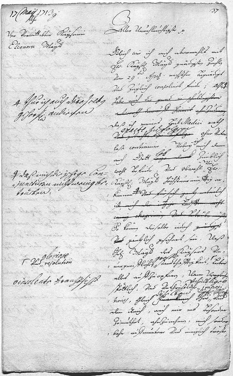 Johann Wilhelm von Pfalz-Neuburg an Eleonora Magdalena von Pfalz-Neuburg, Düsseldorf am 1713.05.17