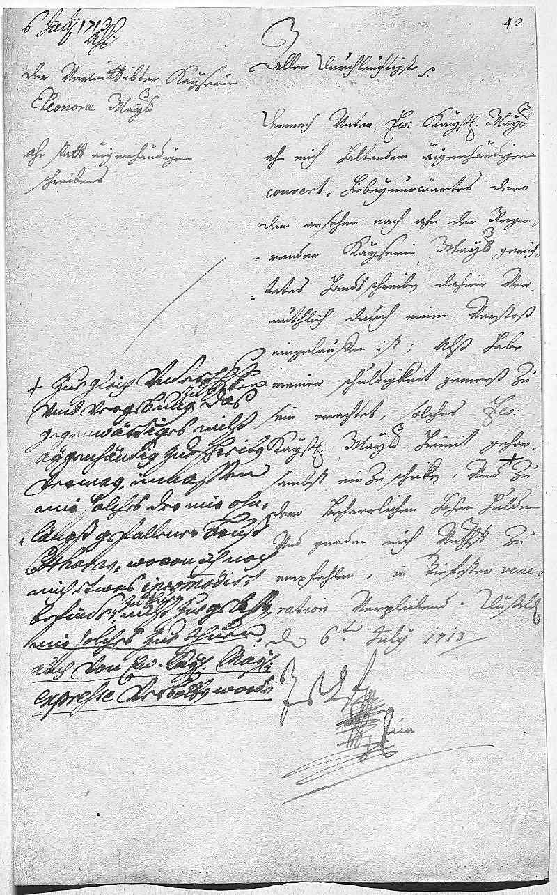 Johann Wilhelm von Pfalz-Neuburg an Eleonora Magdalena von Pfalz-Neuburg, Düsseldorf am 1713.07.06