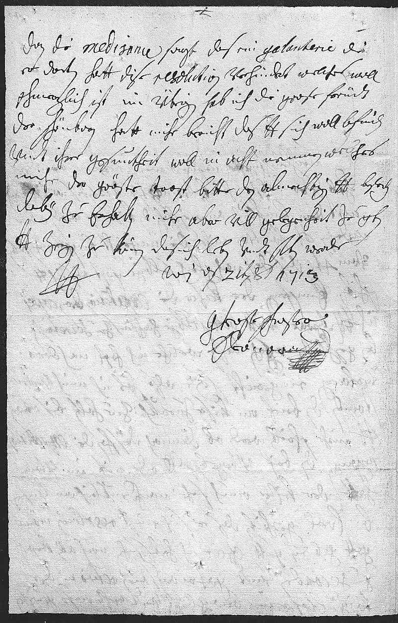 0018dan die medisance sagt, das ein galanterie, die 0019er dorten hatt, dise resolution verhindert, welches woll 0020schmerzlich ist. Im übrigen hab ich die grose freüdt, 0021der Schönborn hatt mihr bericht, das dero Liebden sich woll befinden 0022vndt ihre gesuntheit woll in acht nemmen, welches 0023mihr der gröste trost, bitte den almechtigen, dero Liebden bestendig 0024dabey zu erhalten, mihr aber vill gelegenheit zu geben, 0025dero Liebden zeigen zu können, das ich leben vndt sterben werde 0026dero Liebden 0027getrewste schwester 0028Eleonora 0029Wien den 21ten octobris 1713