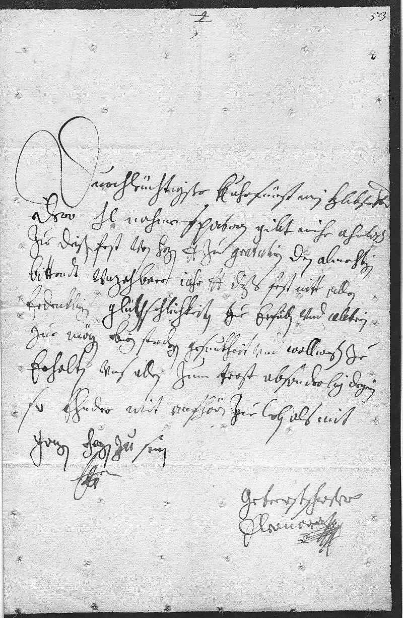 0001Durchleüchtigster Cuhrfürst, mein herzlibster bruder 0002Dero heiliger nahmenspatron gibt mihr ahnlaß, 0003zue diesen fest von herzen dero Liebden zu gratuliren, den almechtigen 0004bittendt, vnzahlbare iahr dero Liebden dises fest mitt allen 0005erdenkligen glükhsehlichkeiten zue erfüllen vnd celebriren 0006zue mögen und bey stendiger gesuntheit vnd wollwesen zue 0007erhalten, vns allen zum trost, absonderlig derjenigen, 0008so ehnder wirt aufhören zue leben als mit 0009ganzen herzen zu sein 0010dero Liebden0011getrewstschwester 0012Eleonora