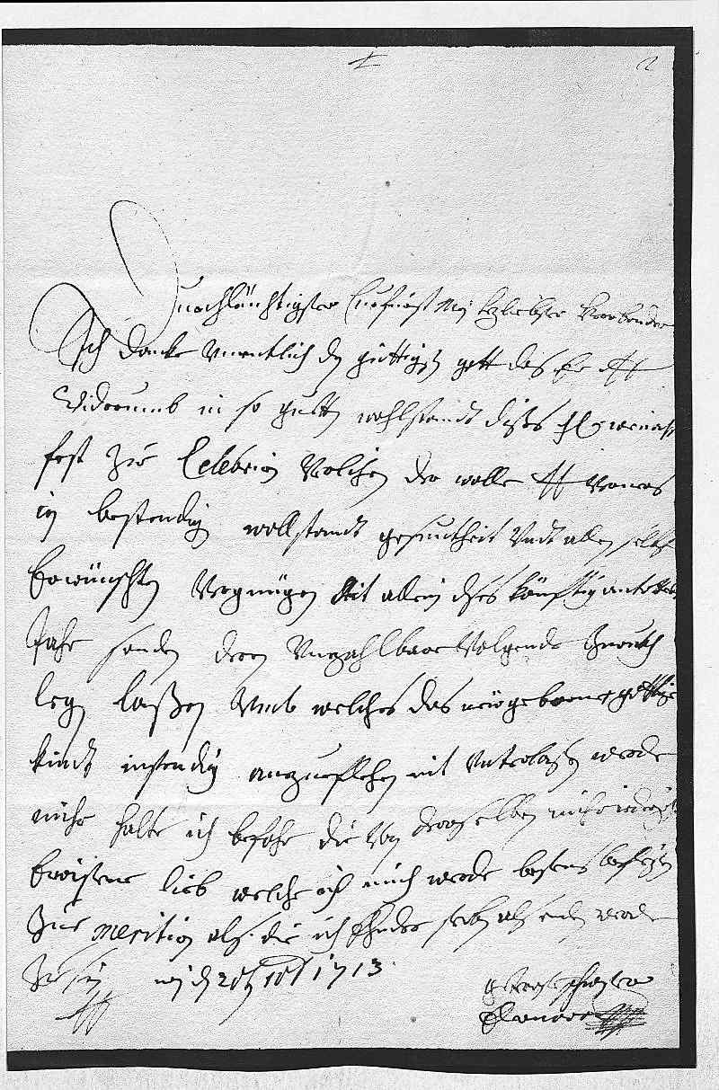 0001Durchleüchtigster Curfürst, mein herzliebster herr bruder 0002Ich danke vnentlich den güttigsten gott, das er dero Liebden 0003widerumb in so guetten wohlstandt dißes heilige weinacht 0004fest zue celebriren verlihen, der wolle dero Liebden verners 0005in bestendigen wollstandt, gesuntheit vndt allen selbst 0006erwünschten vergnügen nit allein dises könftig antrettende0007jahr, sondren deren vnzahlbare volgende zurukh 0008legen laßen, vmb welches das new geborne gottlige 0009kindt instendig anzueflehen nit vnterlaßen werde. 0010Mihr halte ich befohr die von deroselben mihr iederzeit 0011ewisene lieb, welche ich mich werde bestens befleißen 0012zue meritirn, als die ich ehnder sterben als enden werde 0013zu sein 0014dero Liebden 0015getrewste schwester 0016Eleonora 0017Wien den 20ten decembris 1713