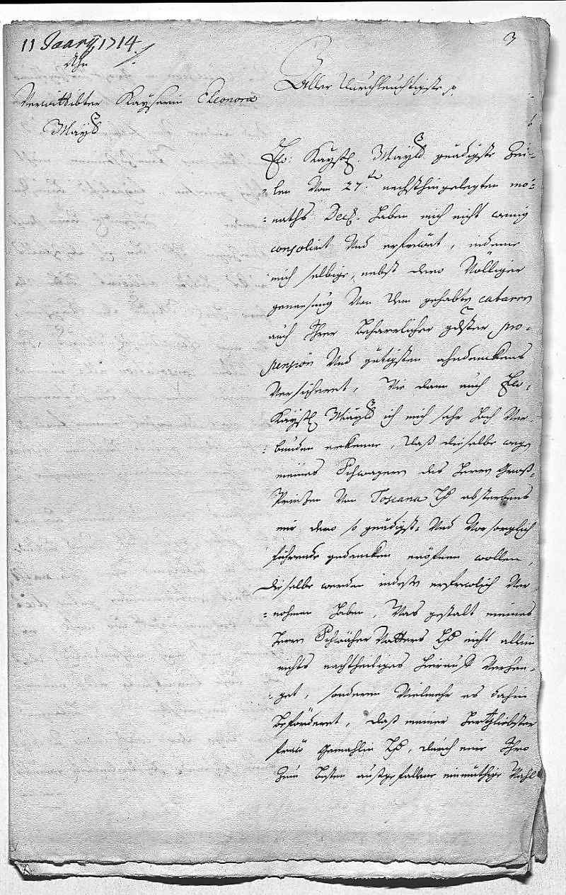 Johann Wilhelm von Pfalz-Neuburg an Eleonora Magdalena von Pfalz-Neuburg, Düsseldorf am 1714.01.11