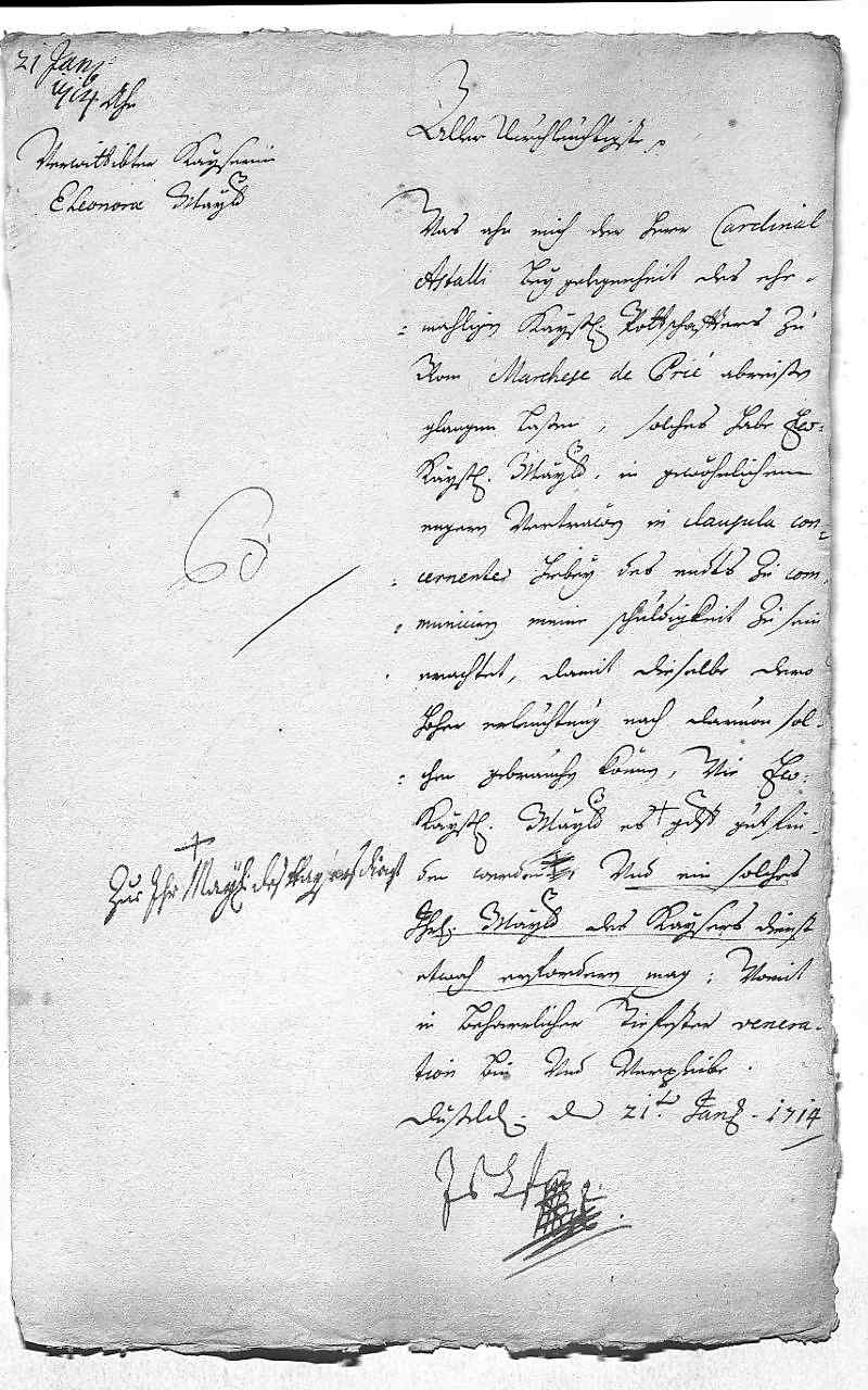 Johann Wilhelm von Pfalz-Neuburg an Eleonora Magdalena von Pfalz-Neuburg, Düsseldorf am 1714.01.21