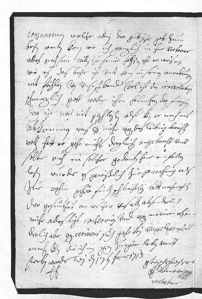 0013conjuncturen, welche allein der güttigste gott zum 0014besten wenden kann, wie ich ganzlich in ihne vertrawe, 0015alles nach sein willen zu seiner hochsten ehr, er weis es, 0016wie es das beste ist, vndt kann in seinen anordnungen 0017nit fählen. Von vnsren herrn bruder Carl ist die irresolution 0018schmerzlich, gott wolle ihm erleuchten. Der fürsten 0019dag ist noch nit geschloßen, also kan er noch nit 0020abkommen. Was dero Liebden mihr wegen des Leibniz berichten 0021wollen, hatt er gahr nichs dergleichen angebracht, vndt 0022solte auch ein solcher gedanken ihme einfallen 0023lasen, wurde es gewißlich hier sowehnig als 0024zue Rohm gehör finden. Schließlig bitt nachmahlen, 0025dero gesuntheit, an welcher vns allen und absonderlich 0026mihr alles ligt, zu conserviren vnd wegen meiner, abson- 0027derlich aber wegen cerimoni sich gahr kein vngelegenheit zu0028machen, als die ich inen ganz zuegehöre, leben vndt 0029sterben werde 0030dero Liebden 0031getrewsteschwester 0032Eleonora 0033Wien den 17ten jener 17130034vertatur