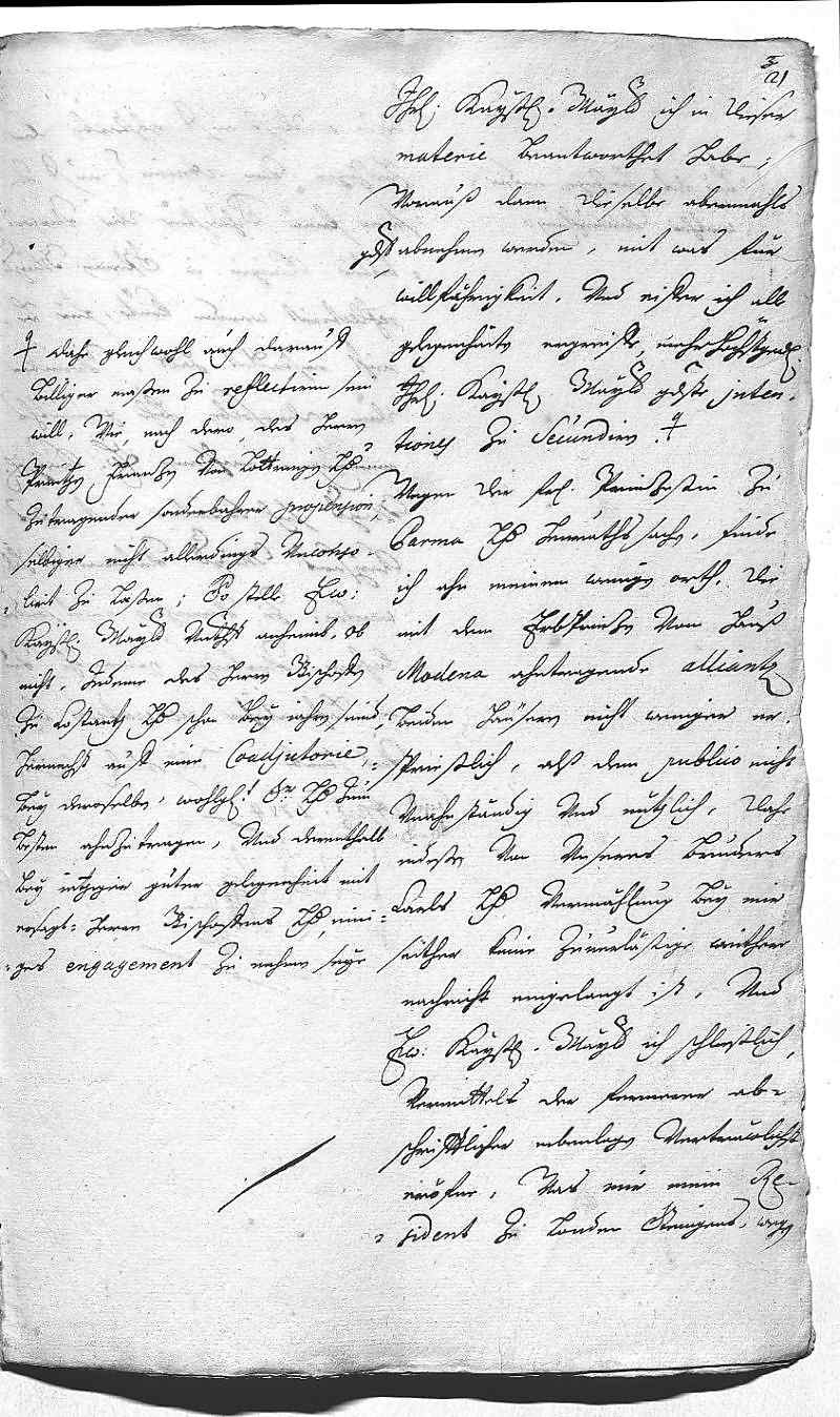 Sendet beiliegend abschriftlich, was er dem Kaiser wegen der toskanischen Eventual-Erbfolgedeklaration geschickt hat. Daraus kann sie ersehen, wie man den Großherzog (von Toskana) und JW ganz unbegründet angeschwärzt hat. Versichert, dass er alles so, wie er es aus Florenz bekommen hat, aufrichtig mitgeteilt hat. – Der Kaiser hat wohl recht, dass der Präliminarfrieden nur zu Konditionen geschlossen werden konnte, die JW und seinem Kurhaus höchst nachteilig sind. Vertraut darauf, dass der Kaiser ihm die Entschädigung, auf die er ihn vertröstet hat, bald zukommen lässt und damit zeigt, dass er treue Bundesgenossen anerkennt. – Stimmt zu, dass die Augsburger Koadjutorwahl nicht länger aufzuschieben ist und dass dabei notfalls der Bischof von Konstanz unterstützt werden sollte. Legt in Abschrift bei, was er dem Kaiser dazu geschrieben hat. – Fände eine Heirat zwischen der Prinzessin zu Parma und dem Erbprinzen von Modena nicht schlecht, zumal er keine weitere Nachricht über Heiratspläne von Bruder Karl (Philipp) hat. – Sendet beiliegend in Kopie einen Bericht seines Residenten Steingens in London darüber, dass nach dem Tod der Herzogin von Anjou (Königin Maria Luisa von Spanien) daran gedacht werden könnte , seine Schwester (Maria Anna), die verwitwete Königin in Spanien, mit dem Herzog von Anjou (König Philipp V. von Spanien) zu verheiraten. Bittet um EMTs Meinung dazu, nachdem sie es mit dem Kaiser besprochen hat.