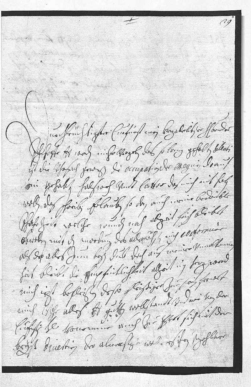 0001Durchleüchtigster Curfürst, mein herzallerlibster herr bruder 0002Ich hoffe, dero Liebden werden mihr vergeben, das so lang gehalten silenti, 0003ist die vhrsach geweßen die occupation der exequien, drauf 0004ein gehabten halsweh vndt cattar, das mich nit haben 0005wollen das schreiben erlauben, so dan auch meine bedrübte 0006ihahrzeit, welche wunden noch allzeit frisch bleibet, 0007obwollen mit den anordnungen des allerhöchsten mich conformire, 0008als der alles zum besten duet, doch aus meiner vnuolkommen- 0009heit bleibt die empfintlichkeit allzeit in herzen. Werd 0010mich iezt befleißen desto fleißiger zue sein. Frewet 0011mich vohr alles, dero Liebden gutten wollstandt vnd, wie von der 0012Curfirstin vernemme, dass sie auch zue pfert sich mit der 0013beyß diuertiren, der almechtige woll es ihren vnzahlbare