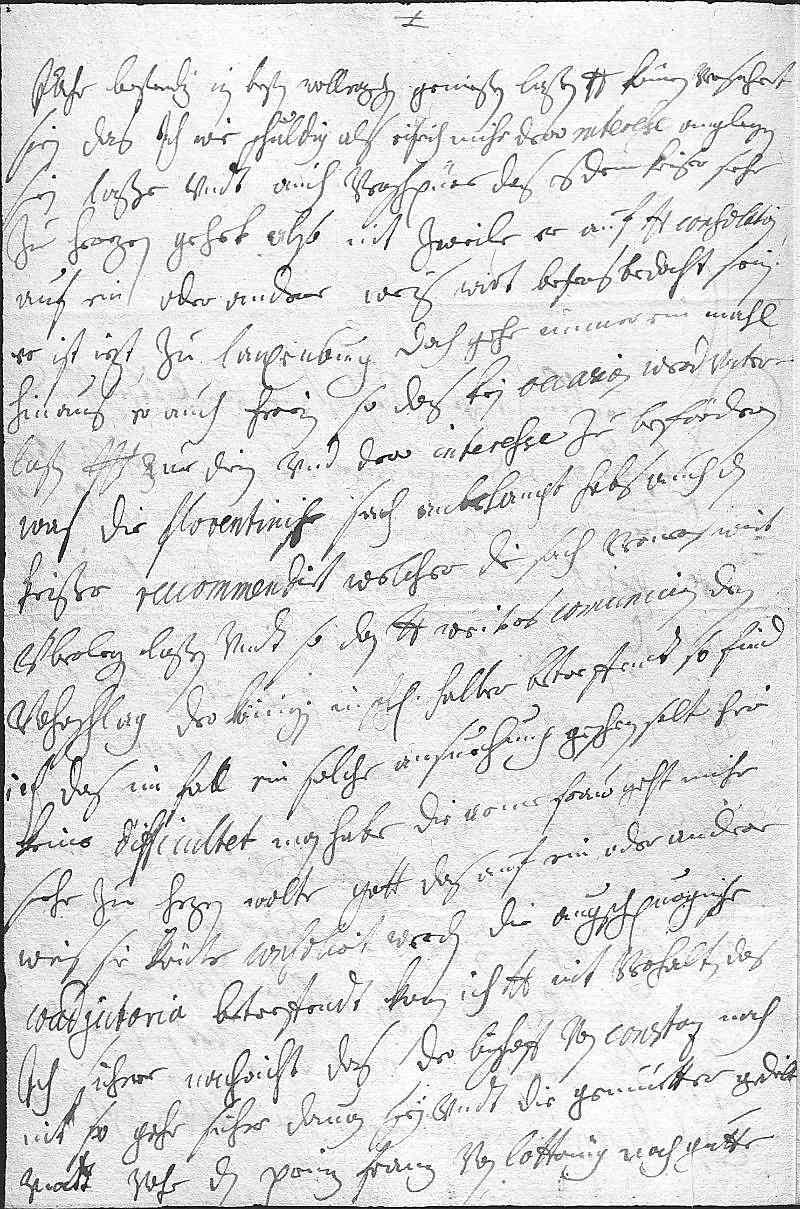 0034hoffnung, dazu gelangen zu können, welches ich nit 0035vnterlaßen wollen, dero Liebden zu benachrichtigen, in deme mihr 0036bekandt die propension, so dero Liebden vohr obedachten Prinzen 0037haben. Finde es auch auf alle weis vohr den Bischoff 0038vndt vnser curhaus vorteilhafftiger, erstlich weil 0039vnser bruder mehr ehr vndt wehniger nachdeilich, ein 0040herrn von ein solchen hauß vndt naheit anverwanten 0041als ein andren vndt fremden, 2 weilen dißer her allzeit 0042mehr esgart vnd respect gegen ihn haben wirt vndt ihn 0043mehr als ein vattern lieben vndt ehren, 3ten auch weder dem 0044Bischoff noch dem capitul im geringsten niks überlastig 0045sein wirt vndt nichts, so lang der güttige gott vnsern 0046herrn brudern das leben fristen wirt, von ihnen wirt verlangen, 00474 bleibt vnser bruder in disen bedrübten zuestandt 0048vndt man nötich findt, das er sich dorten aufhalte, 0049wirt es kein bedenken sein, erholt er sich, wirt er 0050ihme gahr kein vngelegenheit machen, wan er in nit 0051selbst verlangen wirt. Von allen dißen seint mihr 0052bey kein andren subjecto als als bey ihne gesichert, 0053zweifle also gahr nit, dero Liebden werden nach allen kreften dazu 0054coperiren, das woh möglich er dazu gelangen möge,