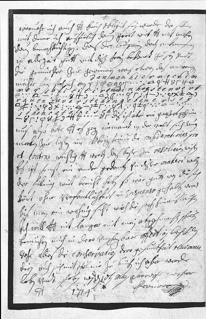 0055waruohr ich auch dero Liebden ewich obligirt sein werde. Der Siking, 0056mit deme ich ausfürlich dauon geret, wirt dero Liebden mit mehren 0057dazu benachrichtigen. Das der Curprinz dorten ankommen, 0058ist allezeit gutt mit disen heren bekandt zu sein vndt 0059die gemüehter zue gewinnen, was etwan das anbrengen 0060dan man hier noch im 0061möchte sein, steh ich an dan man hier noch im0062mer solicitirt und in hogsten vert 0063mer solichsirt und in högsten vert0064rauen zuverstehen geben er sey 0065rauen zu verstehen geben er sei0066schon catolisch 0067schon catolisch dis ist aber ein großes geheim- 0068nus, also bitte dero Liebden, es gegen niemandt in der welt sich dauon 0069merken zue laßen. Im übrigen seindt die considerationes pro 0070et contra wichtig, dero Liebden werden das beste zu resoluiren wißen. 0071Es ist sonst ein ander gedanken in dißer materi welgen 0072der Siking wirt bericht haben, so wär guett, wan die sach 0073könt ohne verfanklichkeit in suspenso gehalten werde, 0074bis man ein wehnig sicht, wih die sachen hinaus laufen. 0075Ich will dero Liebden nit langer mit mein abgeschmachten schreiben 0076bemühen, mich in dero vnschazbare affection befehlen 0077vohr alles, die conservation dero gesuntheit recommen- 0078diren, auch sich mit schreiben nie zu bemühen. Ich aber werde 0079leben vndt sterben 0080dero Liebden 0081getrewste schwester 0082Eleonora 0083Wien den 10ten maij 00841714