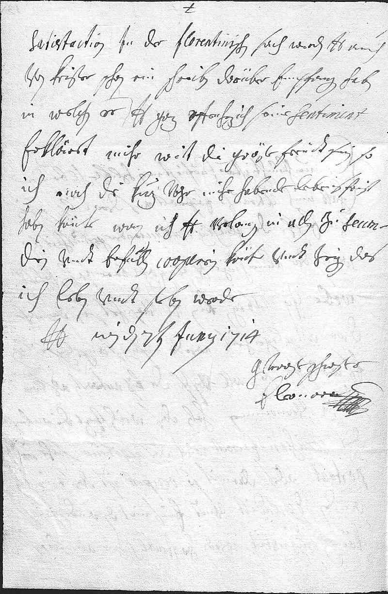 0013satisfaction. In der florentinischen sach werden dero Liebden auch 0014von Keißer schon ein schreiben dorüber empfangen haben, 0015in welchen er dero Liebden ganz offenherzich seine sentiment 0016erkläret. Mihr wirt die gröste freüdt sein, so 0017ich noch die kurz vohr mihr habende lebensfrist 0018haben könte, wan ich dero Liebden verlangen in allen zu seccon- 0019dirn vndt erfüllen cooperirn könte vndt zeigen, das 0020ich leben vndt sterben werde 0021dero Liebden 0022getrewste schwester 0023Eleonora 0024Wien den 7ten junij 1714