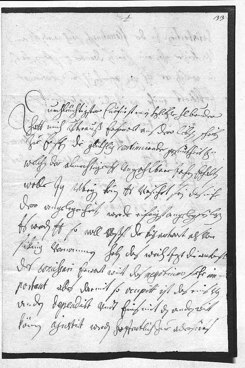 0001Durchleüchtigster Curfürst, mein herzlibster herr bruder 0002Hatt mich überauß erfrewet, aus dero liebsten schreiben 0003zue ersehen die glükhlig continuirnde gesuntheit, bey 0004welcher der almechtige dero Liebden vnzahlbare jahren erhalten 0005wolle. In vbrigen könen dero Liebden versichert sein, das mihr 0006dero angelegenheiten werde eifrigst angelegen sein lasen. 0007Es werden dero Liebden so woll auß der kaiserlichen antwort als von 0008Siking vernommen haben, das weilen jezt die ankonft 0009des comissari erwart wirt und das negotium sehr im- 0010portant, alles darmit so ocupirt ist, das eins von 0011andren dependirt vndt eins mit den andren wirt 0012können ajustirt werden, hoffentlich zue allerseits