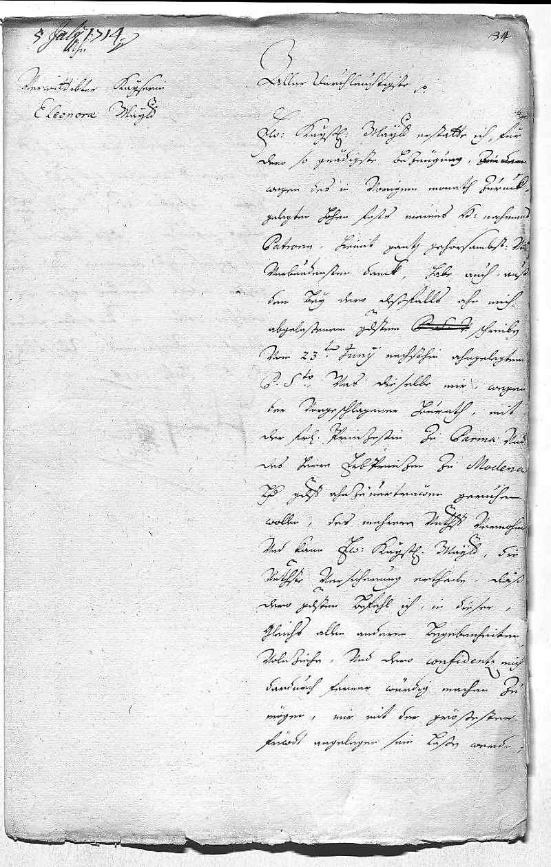Dankt für die Glückwünsche zum Namenstag. – Wird sehr gerne EMTs Befehl im Zusammenhang mit der vorgeschlagenen Heirat zwischen der Prinzessin zu Parma und dem Erbprinzen zu Modena befolgen. Die von EMT angekündigte Beilage hat aber gefehlt; bittet um deren Zusendung.