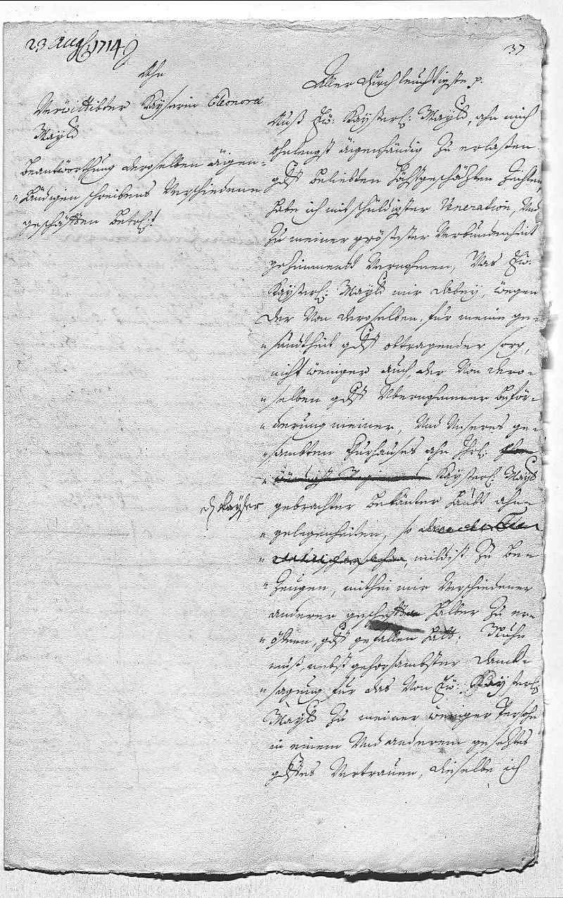 Johann Wilhelm von Pfalz-Neuburg an Eleonora Magdalena von Pfalz-Neuburg, Düsseldorf am 1714.08.23