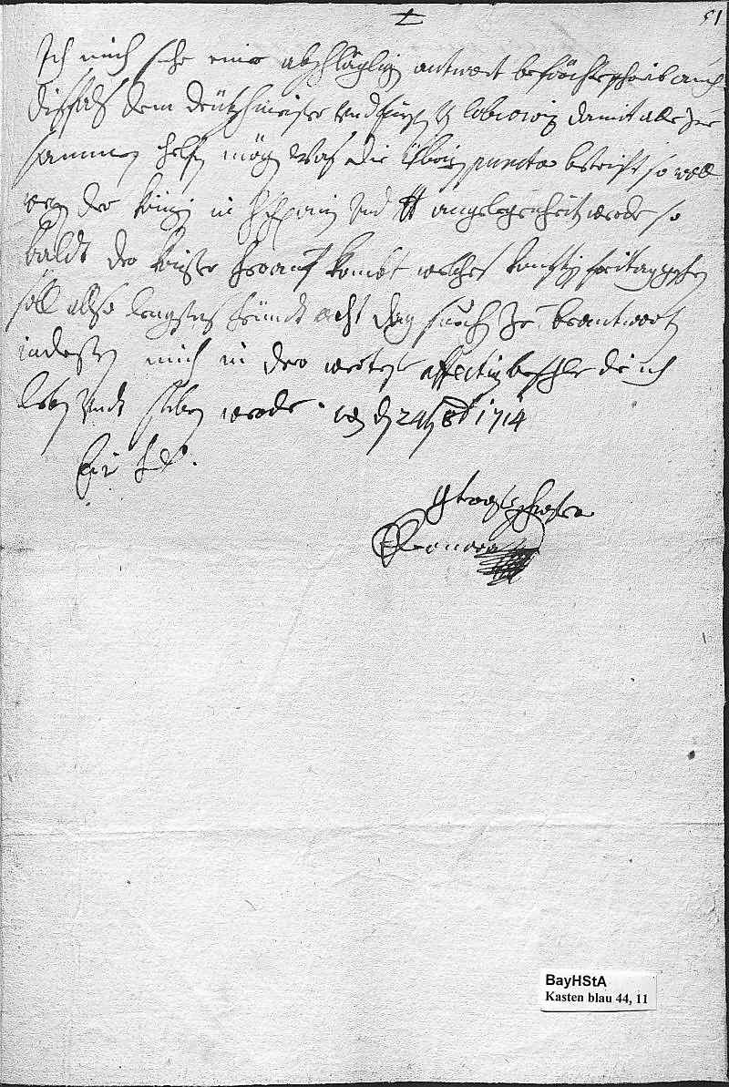 0038ich mich sehr einer abschlägligen antwort beförchte. Schreib auch 0039disfals dem Deütschmeister vnd Fürsten von Lobcowiz, damit alle zue 0040sammen helfen mögen. Was die übrigen puncta betrift, so woll 0041wegen der Königin in Schpanien vnd dero Liebden angelegenheiten, werde, so 0042baldt der Kaißer herauf kombt, welches konftigen freitag geschen 0043soll, also lengstens heündt acht dag, suechen zu beantworten, 0044indeßen mich in dero werteste affection befehle, die ich 0045leben vndt sterben werde 0046ewer Liebden 0047getrewste schwester 0048Eleonora 0049Wien den 24ten octobris 1714
