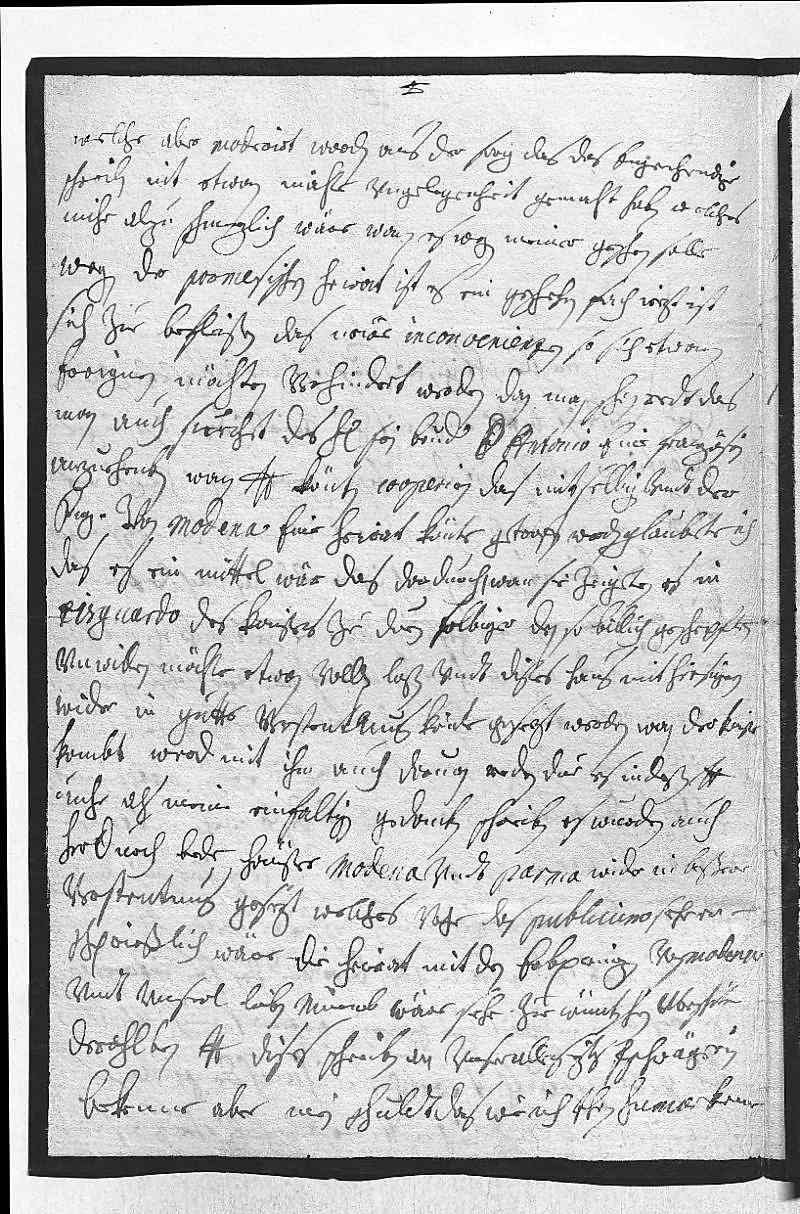 0017welche freude aber moderirt worden aus der sorg, das das eigenhendige 0018schreiben nit etwan möchte vngelegenheit gemacht haben, welches 0019mihr alzu schmerzlich wäre, wan es wegen meiner geschen solle. 0020Wegen der parmesischen heirat, ist es ein geschehen sach, iezt ist 0021sich zue befleißen, das newe inconvenienzen, so sich etwann 0022ereignen möchten, verhindert werden, dan man schon redt, das 0023man auch suechet, des Herzog sein bruder Don Antonio eine französin 0024anzuehenken. Wan dero Liebden könten cooperiren, das mit selbigen vndt der 0025Prinzessin von Modena eine heirat könte getroffen werden, glaubete ich, 0026das es ein mittel wär, das dardurch, wan sie zeigeten es in 0027risguardo des Kaisers zu duen, selbiger den so billich geschepften 0028vnwillen möchte etwan vallen laßen vndt dißes haus mit hiesigen 0029wider in gutte verstentnus könte gesezt werden. Wan der Kaiser 0030kombt, werd mit ihm auch daruon reden, due es indesen dero Liebden 0031nuhr als mein einfaltigen gedanken schreiben. Es wurden auch 0032herdurch bede haüßer Modena vndt Parma wider in beßere 0033verstentnus gesezt, welches vohr das publicum sehr er- 0034schprießlich wäre. Die heirat mit den Erbprinzen von Modena 0035vndt vnser lieben muemb wäre sehr zue wüntschen, vberschik0036derohalben dero Liebden dises schreiben an vnser allerseits fraw schwägerin, 0037bekenne aber mein schuld, das wie ich ihren humor kenne,