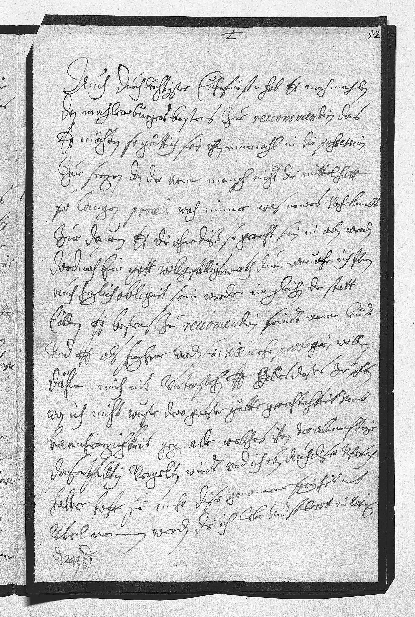 0050Auch, duchleuchtigster Curfürst, hab dero Liebden nachmahlen 0051den mahler Burgers bestens zue recommendiren, das 0052dero Liebden möchten so güttich sein, ihn einmahl in die possession 0053zue sezen, dan der arme mensch nicht die mittel hatt, 0054so langen process, woh immer was newes vohrkombt, 0055zue dauren. Dero Liebden, die ohne diß so gerecht sein in allen, werden 0056dardurch ein gott wollgefälligs werkh duen, waruohr ich ihnen 0057auch herzlich obligirt sein werde. Imgleichen die statt 0058Cöllen dero Liebden bestens zu reccomendiren, seindt arme leüdt, 0059vnd dero Liebden als schuzherr werden sie vill mehr protegiren wollen. 0060Dähte mich nit vnterstehen, dero Liebden alles dises zu schreiben, 0061wan ich nicht wuste dero große güette, gerechtichkeit vndt 0062barmherzichkeit gegen alle, welches ihren der almechtige 0063dausentfalltig vergelten wirdt, vnd ich ebenso. Auch diser vhrsach 0064halber hoffe, dass sie mihr dise genommene freyheit nit 0065vbel nemmen werden, die ich lebe vnd sterb, vt in literis 0066den 24ten octobris .