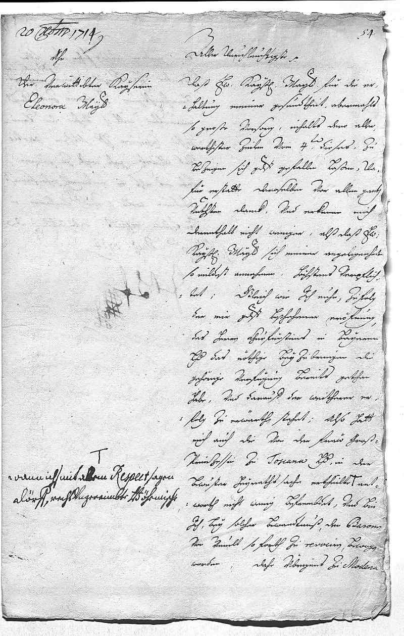 Hat bereits angeordnet, dem Kurfürsten in Bayern das Nötige mitzuteilen. – Die Antwort der Prinzessin zu Toskana (Schwägerin Anna Maria Franziska) in der bewussten Heiratssache hat ihn nicht wenig befremdet; hat den Freiherrn von Weveld zurückberufen. – Der Prinzessin Casimira (Sobieski) wäre die Partie (mit dem Erbprinzen von Modena) wohl zu gönnen.