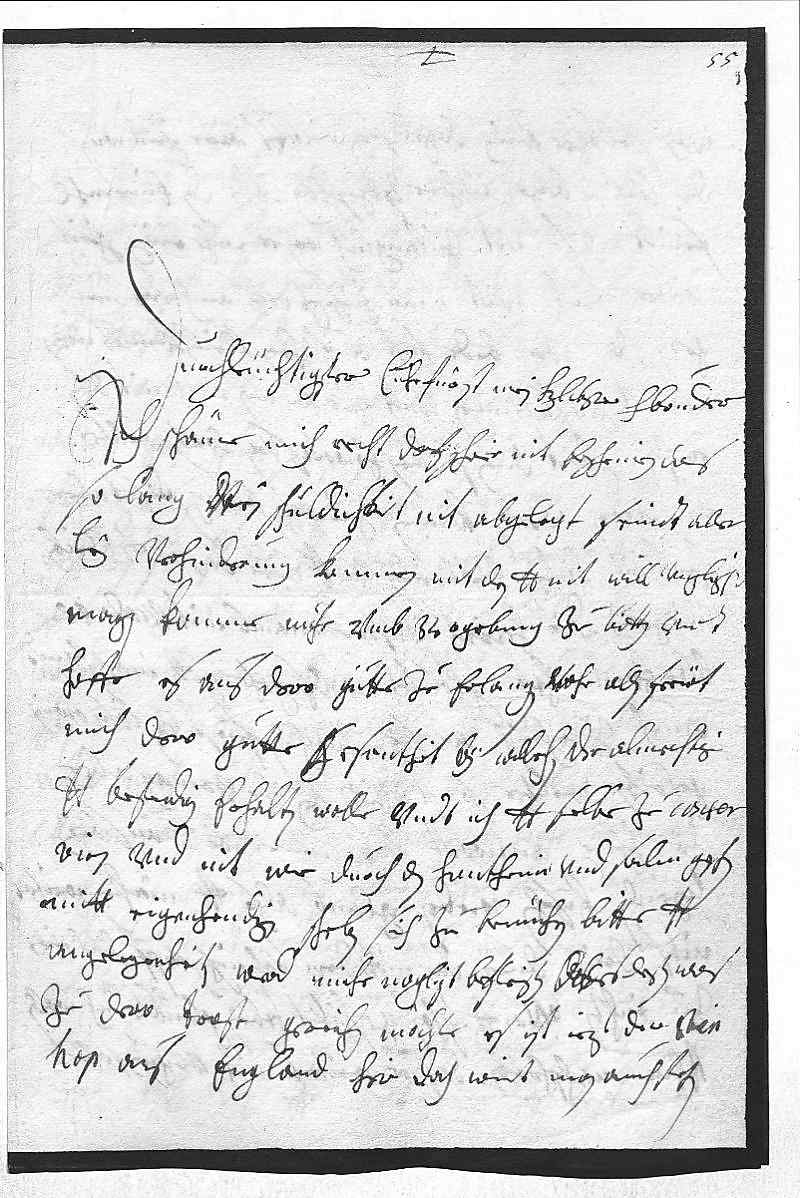 0001Durchleüchtigster Cuhrfürst, mein herzlibster herr bruder 0002Ich schäme mich recht, derf schier nit erscheinen, das 0003so lang mein schuldichkeit nit abgelegt. Seindt aller- 0004ley verhinderung kommen, mit den dero Liebden nit will vngelegenheiten 0005magen, komme nuhr vmb vergebung zu bitten vndt 0006hoffe, es aus dero gütte zu erlangen. Vohr allen frewt 0007mich dero gutte gesontheit, bey wellchen der almechtige 0008dero Liebden bestendig erhalten wolle, vndt ich dero Liebden selbe zu conser- 0009viren vnd nit, wie durch den Huntheim vnd Salm geschen, 0010mitt eigenhendigen schreiben sich zu bemühen bitte. Dero Liebden 0011angelegenheiten werd mihr moglist befleißen, alles deßen, was 0012zu dero trost gereichen möchte. Es ist izt der Stin- 0013hop aus England hier, dah wirt man auch sehen,