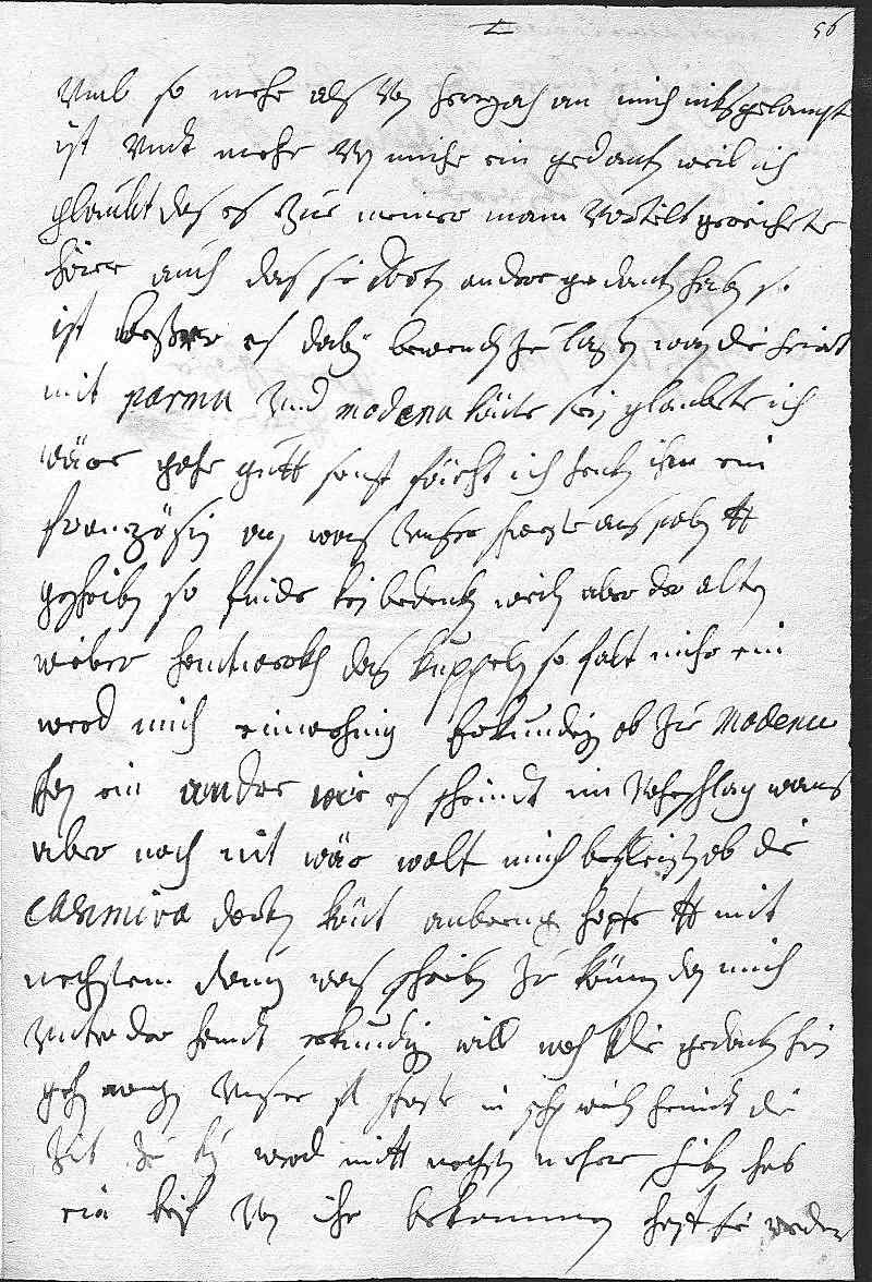 0032vmb so mehr, als von Herzoch an mich niks gelangt 0033ist vndt mehr von mihr ein gedanken, weil ich 0034glaubt, das es zue meiner mam vorteilt gereichete. 0035Höre auch, das sie dorten andere gedanken haben, so 0036ist beßer, es dabey bewenden zu laßen. Wan die heirat 0037mit Parma vnd Modena könte sein, glaubete ich, 0038wäre gahr gutt, sonst förcht ich, sie henken ihm ein 0039französin an. Was vnser schwester aus Polen dero Liebden 0040geschriben, so finde kein bedenken, weilen aber der alten 0041weiber hantwerkh das kuppeln, so falt mihr ein, 0042werd mich einwehnig erkundigen, ob zue Modena 0043schon ein andre, wie es scheindt, im vohrschlag, wans 0044aber noch nit wär, wolt mich befleißen, ob die 0045Casimira dorten könt anbrengen, hoffe dero Liebden mit 0046nechstem dauon was schreiben zu können, dan mich 0047vnter der hant erkundigen will, woh die gedanken hin 0048gehen. Wegen vnser fraw schwester in Schpanien, weilen heündt die 0049zeit zu kurz, werd mitt nechsten mehrer schreiben, hab 0050ein brif von ihr bekommen, hoff sie werden