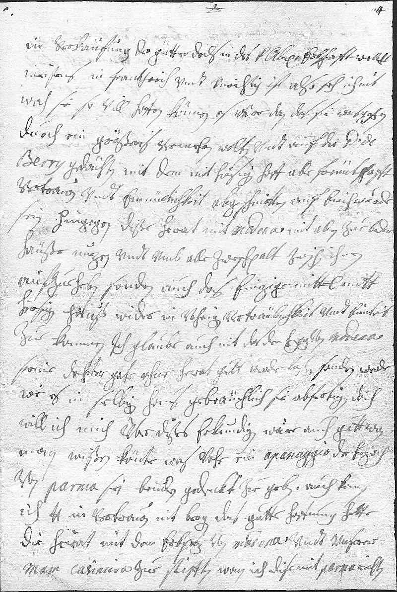 0034in verkaufung der gütter, deils in des Prinz Alexander erbschafft, welche 0035meistens in Frankhreich vndt vnrichtig ist. Also seh ich nit, 0036wah sie so vill hoffen können, es wäre dan, das sie, was geschen, 0037durch ein größeres vermehren wolten vndt auf die Duchesse de 0038Berry gedächten, dadurch mit dem mit hiesigen hoff alle freüntschafft, 0039vertrawen vndt einmütichkeit abgeschnitten auf ewich werde 0040sein. Hingegen würde diße heirat mit Modena mit allen zue beder 0041haüßer nuzen vndt vmb alle zweschpalt zwischen ihnen 0042aufzueheben, sondren auch das einzige mittel sein, mitt 0043hirsigen hauß wider in vohrigen vertraülichkeit vndt einikeit 0044zue kommen. Ich glaube auch nit, das der Herzog von Modena 0045seine dochter gahr ohne heirat gutt werde laßen, sondren werde, 0046wie es in selbigen haus gebraüchlich, sie abfertigen, doch 0047will ich mich über dißes erkundigen, wäre auch gutt, wan 0048man wißen könte, was vohr ein apanaggio der Herzoch 0049von Parma sein brudren gedenkt zue geben. Auch kann 0050ich dero Liebden in vertrawen nit bergen, das gutte hoffnung hette, 0051die heirat mit dem Erbprinz von Modena vndt vnserer 0052mam Casimira zue stifften, wan ich dise mit Parma richten