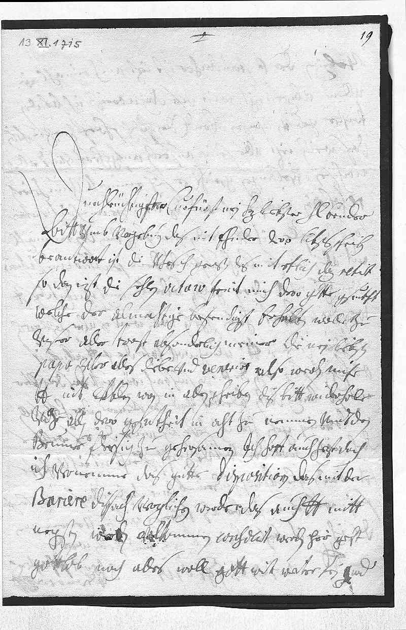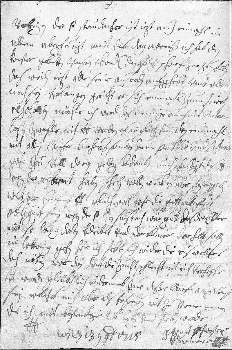 0001Durchleüchtigster Curfürst, mein herzliebster herr bruder 0002Bitt vmb vergebung, das nit ehnder dero libsts schreiben 0003beantwort, ist die vhrsach gewesen, das mit etlich dag retirirt, 0004so dan izt die sehlen octaw. Freüt mich dero gutte gesuntheit, 0005welche der almechtige bestendigst erhalten wolle zu 0006vnser aller trost, absonderlich meiner, die mein liebsten 0007papa vber alles liebe vnd venerire. Also werden mihr 0008dero Liebden nit vblen, wan in allen schreiben dis bitt widerhole, 0009vohr allen dero gesuntheit in acht zu nemmen vndt den 0010Bruner fleisich zu gehorsamen. Ich hoff auch jezt, dah 0011ich vernemme, das gutte dispositionen, das mit der 0012bariere dissach verglichen werde, das auch dero Liebden mitt 0013negsten werden volkommen consolirt werden. Hier geht 0014gottlob noch alles woll, gott wirt weiter sein gnad