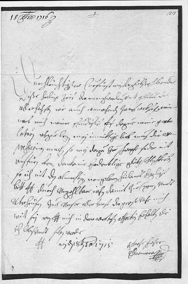 000118 decembris 17160002Durchleüchtigster Curfürst, mein herzliebster herr bruder 0003Diße heilige zeit der menschwerdung vndt geburdt des 0004allerhochsten wie auch annahenden jares weksel erin- 0005nert mich meiner schuldichkeit, dero Liebden dazue meine gratu- 0006lation abzuelegen. Mein inniklige lieb mus die ex- 0007pressionen machen, so mein dazu zue schwache feder nit 0008ausfüren kan, danke nie erdenklige glükhsehlichkeiten, 0009so ich nit den almechtigen neugebornen heilandt herzligst 0010bitt, dero Liebden durch vnzahlbar iahren damit zuesegnen vndt zu0011vberheüfen zue vnser aller trost. Der groste vohr mich 0012wirt sein, wan dero Liebden mich in dero wertesten affection erhalten, die 0013ich leben vndt sterben werde 0014dero Liebden 0015getrewste schwester 0016Eleonora 0017Wien den 18ten decembris 1715