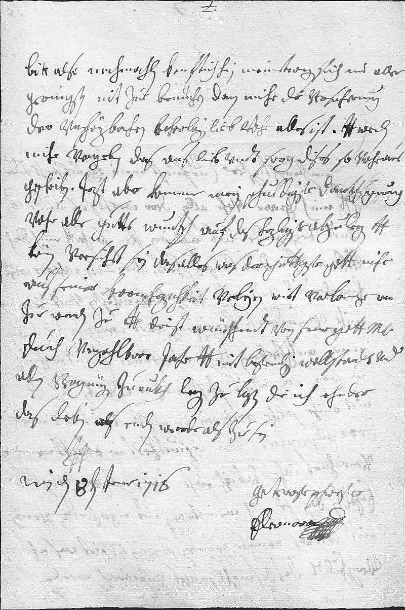 0015Bitt also nochmahlen, konftichhin meintwegen sich im aller- 0016geringsten nit zue bemühen, dan mihr die versicherung 0017dero vnschäzbahren beharligen lieb vohr alles ist. Dero Liebden werden 0018mihr vergeben, das aus lieb vndt sorg dises so vohraus 0019geschriben. Jezt aber komme, mein schuldigste dankhsagung 0020vohr alle gutte wuntsch auf das herzligste abzulegen, dero Liebden 0021könen versichert sein, das alles, was der guttigste gott mihr 0022aus seiner barmherzichkeit verleyen wirt, verlange an 0023zue wenden zu dero Liebden dienst, wünschendt von seiner göttlichen Mayestät, 0024durch vnzahlbare jahr dero Liebden mit bestendigen wollstandt vnd 0025allen vergnügen zurukh legen zue laßen, die ich ehnder 0026das leben als enden werde als zu sein 0027dero Liebden 0028getrewste schwester 0029Eleonora 0030Wien den 8ten jener 1716