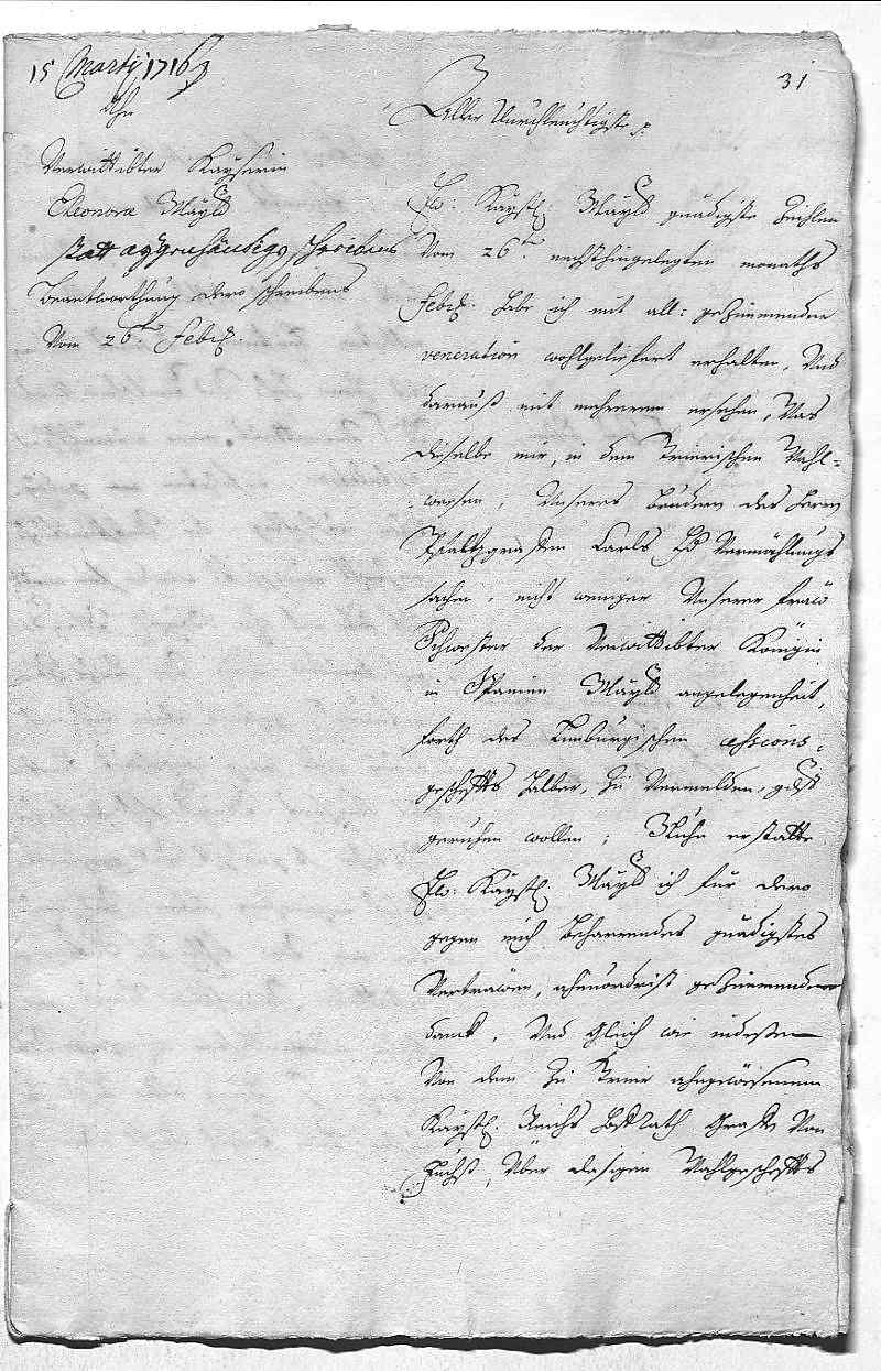 Johann Wilhelm von Pfalz-Neuburg an Eleonora Magdalena von Pfalz-Neuburg, Düsseldorf am 1716.03.15