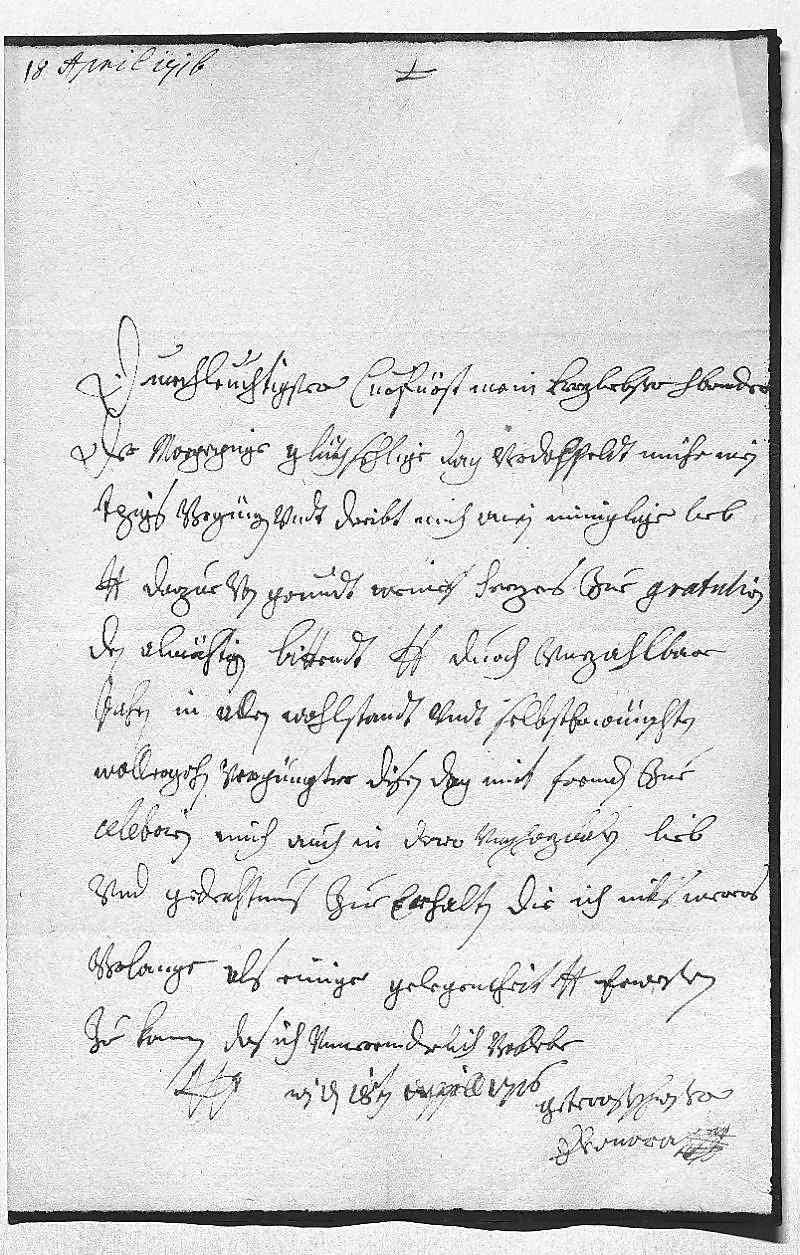 000118 april 17160002Durchleüchtigster Curfürst, mein herzliebster herr bruder 0003Der morgeginge glükhsehlige dag verdoppeldt mihr mein 0004jezigs vergnügen, vndt dreibt mich mein inniglige lieb, 0005dero Liebden darzue von grundt meines herzes zue gratulirn, 0006den almächtigen bittendt, dero Liebden durch vnzahlbare 0007jahren in allen wohlstandt vndt selbsterwünschten 0008wollergehn vergnügter disen dag mit frewden zue 0009celebrirn, mich auch in dero vnschazbaren lieb 0010vnd gedechtnus zue erhalten, die ich niks merers 0011verlange als einige gelegenheit, dero Liebden erweisen 0012zu konnen, das ich vnuerenderlich verbleibe 0013dero Liebden 0014getrewstschwester 0015Eleonora 0016Wien den 18ten apprill 1716
