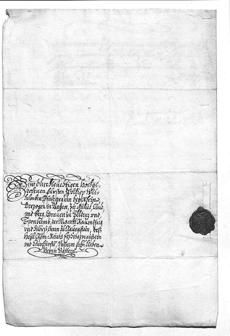 0028Dem durchleüchtigen hochge- 0029bohrnen Fürsten Philipp Wil- 0030helmben Pfalzgrauen bey Rhein, 0031Herzogen in Bayrn, zu Gülich, Cleue, 0032vnd Berg, Grauen zu Veldenz vnd 0033Sponheimb, der Marckh, Rauenspurg 0034vnd Mörß, Heren zu Rauenstein, deß 0035Heyligen Römischen Reichs Erzschazmaistern 0036vnd Churfürsten, vnßerm freundlichen lieben 0037herrn vattern