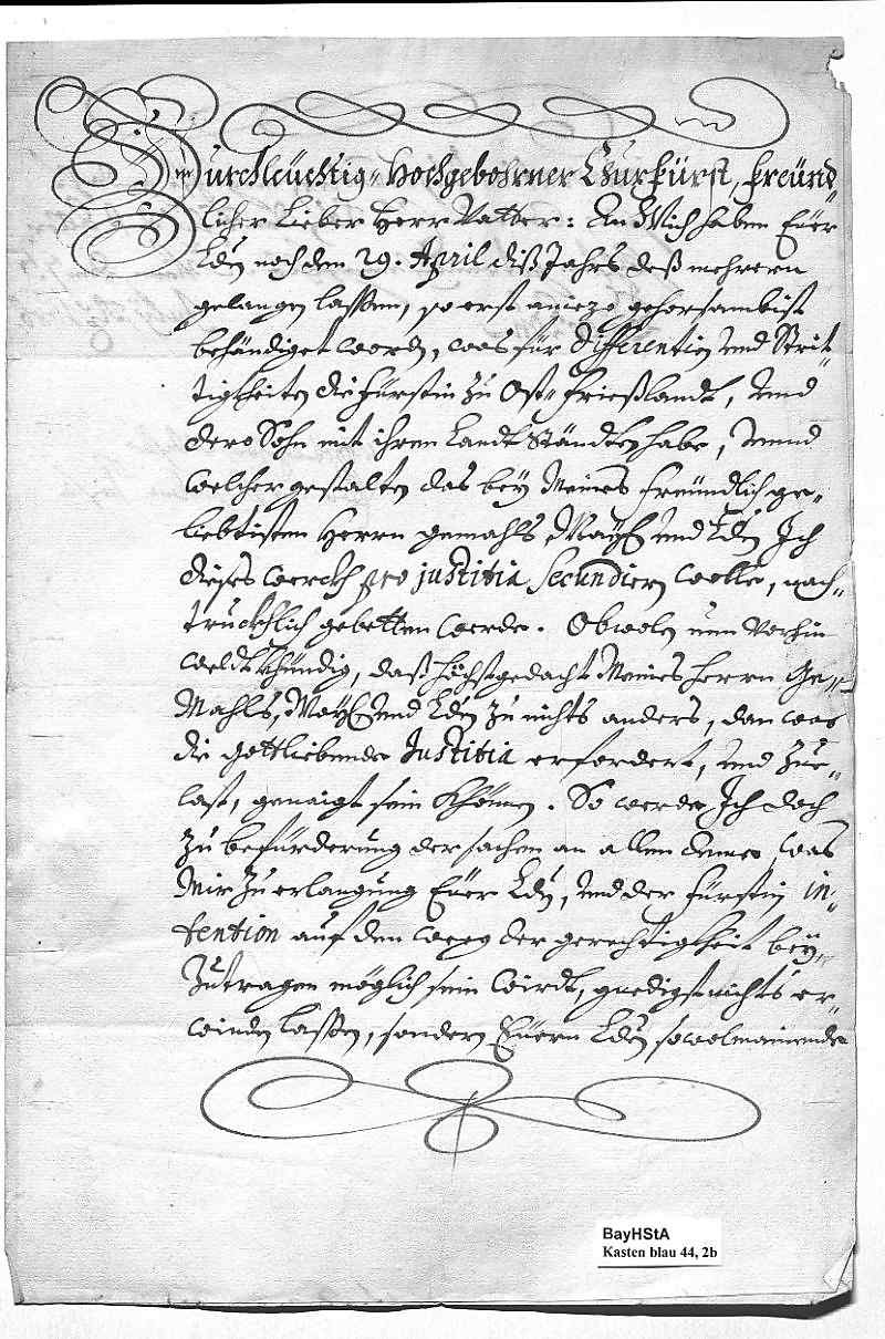 0001Durchleüchtig-hochgebohrner Churfürst, freünd- 0002licher lieber herr vatter. An mich haben eüer 0003Liebden noch dem 29. april diß jahrs deß mehrern 0004gelangen lasßen, so erst aniezo gehorsambist 0005behändiget worden, was für differentien vnd strit- 0006tigkheiten die Fürstin zu Ost-Frießlandt, vnd 0007dero sohn mit ihren landtständten habe, vnnd 0008welcher gestalten das bey meines freündlich ge- 0009liebtisten herrn gemahls, Mayestät vnd Liebden, ich 0010dieses werckh pro justitia secundirn wolle, nach- 0011truckhlich gebetten werde. Obwolen nun vorhin 0012weldtkhündig, daß höchstgedacht meines herrn ge- 0013mahls, Mayestät vnd Liebden, zu nichts anders, dan was 0014die gottliebende justitia erfordert, vnd zue- 0015last, genaigt sein khönnen. So werde ich doch 0016zu befürderung der sachen an allem deme, was 0017mir zu erlangung eüer Liebden, vnd der Fürstin in- 0018tention auf den weeg der gerechtigkheit bey- 0019zutragen möglich sein wirdt, gnedigst nichts er- 0020winden lasßen, sondern eüern Liebden so wol mainende