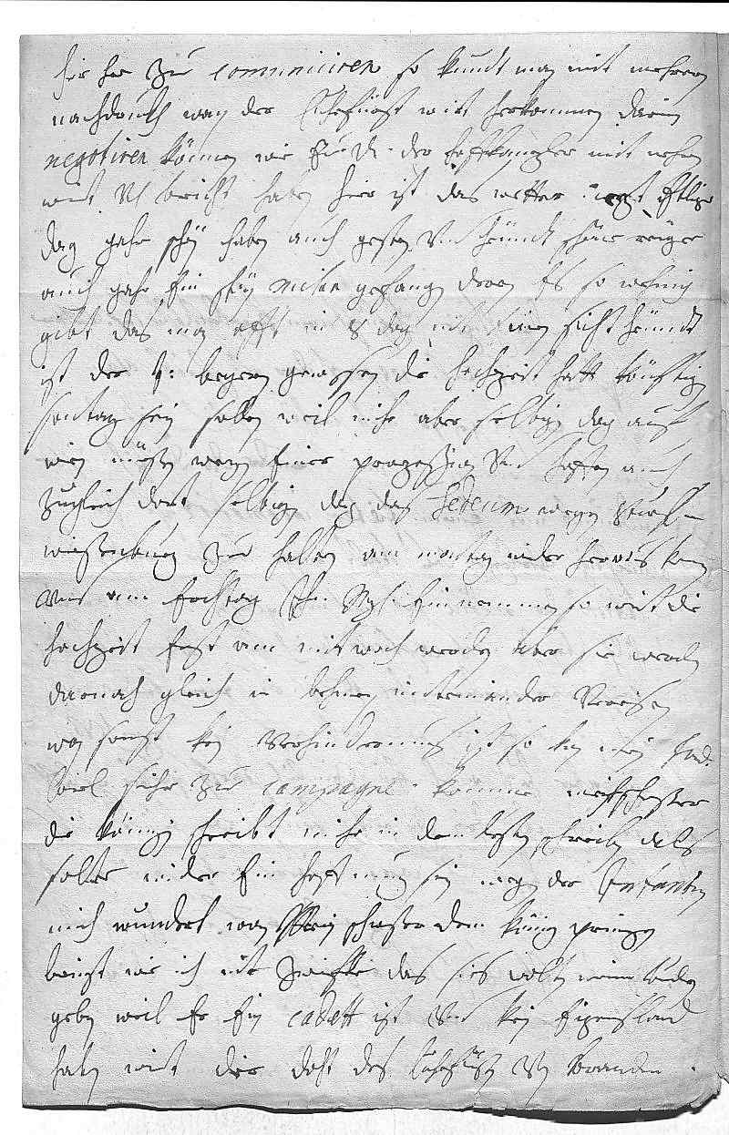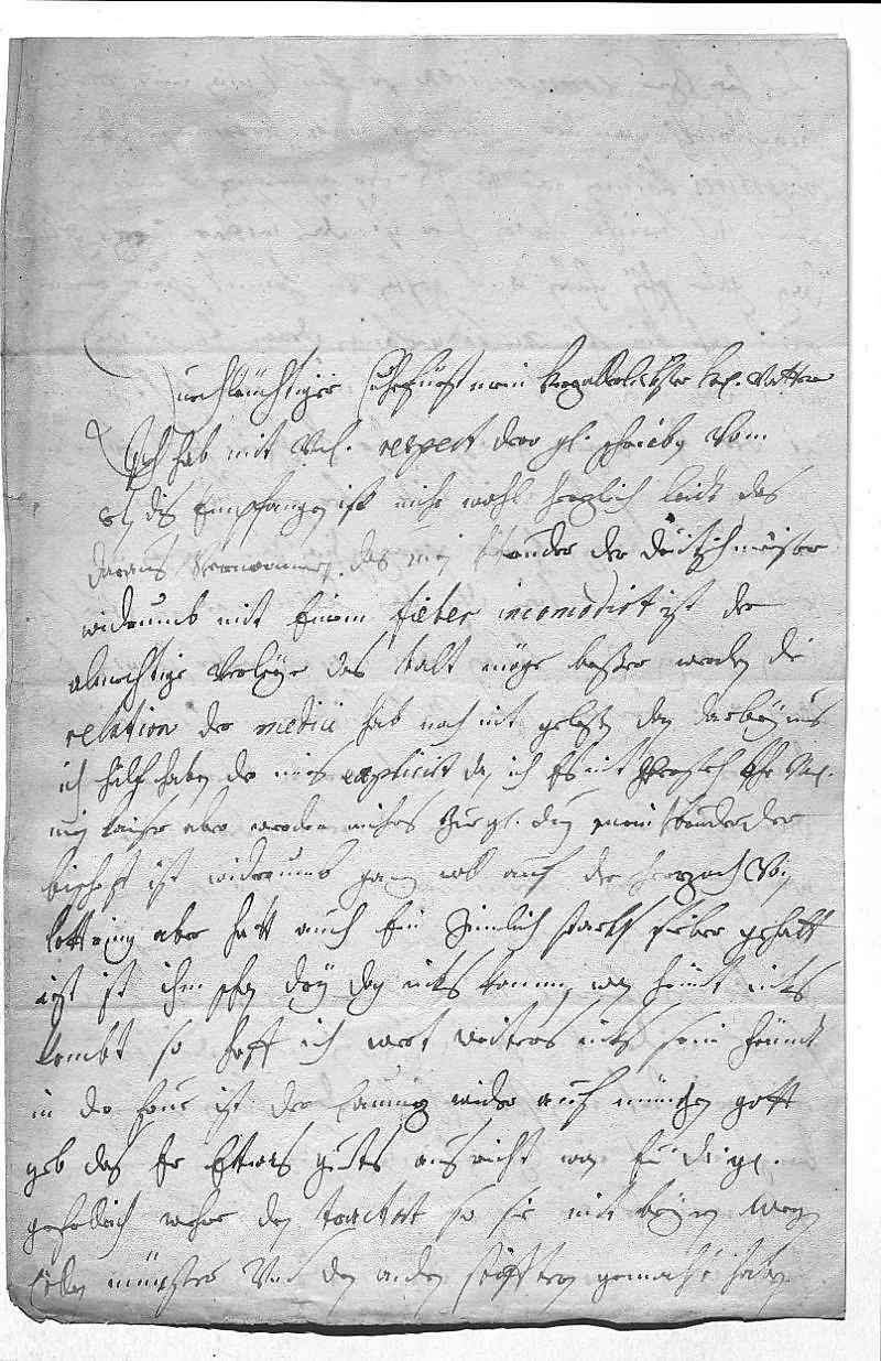 0001Durchleüchtiger Cuhrfürst, mein herzallerliebster herr vatter 0002Ich hab mit vnterdehnigstem respect dero gnädiges schreiben vom 00038ten dis empfangen. Ist mihr wohl herzlich leidt, das 0004daraus vernommen, das mein herr bruder, der Deütschmeister, 0005widrumb mit einem fieber incomodirt ist, der 0006almechtige verleye, das balt möge beßer werden. Die 0007relation der medici hab noch nit geleßen, dan darbey mus 0008ich hülf haben, der mirs explicirt, dan ich es nit versteh, ihr Mayestät, 0009mein Kaiser, aber werden mihrs zue gnade duen. Mein herr bruder, der 0010Bischoff, ist widerumb ganz woll auf, der Herzoch von 0011Lottring aber hatt auch ein zimlich starks fieber gehabt. 0012lezt ist ihm schon drey dag niks kommen, wan heünt niks 0013kombt, so hoff ich, wert weiters niks sein. Heündt 0014in der frue ist der Cauniz wider auf München, gott 0015geb, das er etwas guets ausricht. Wan ewer Durchlaucht gnädigst 0016gefellich wehre, den tractat, so sie mit Beyrn wegen 0017Cöllen, Münster vnd den andren stätten gemacht haben,