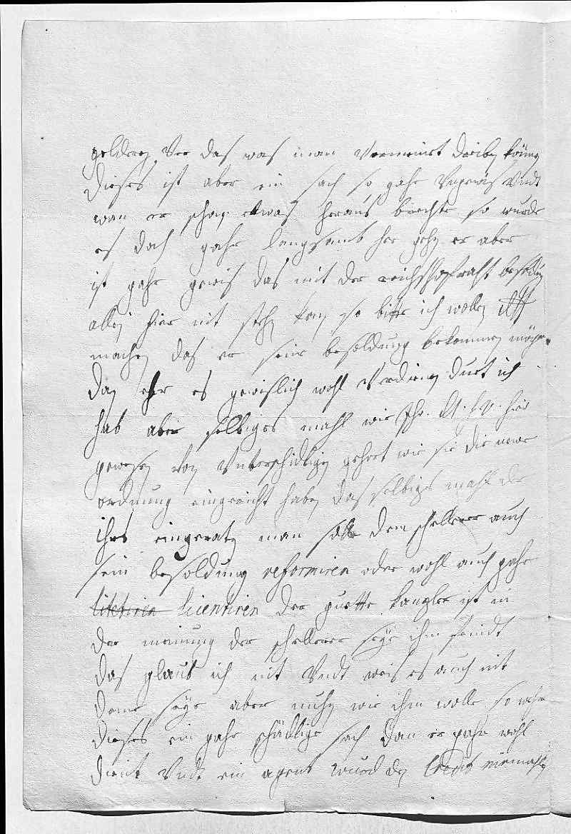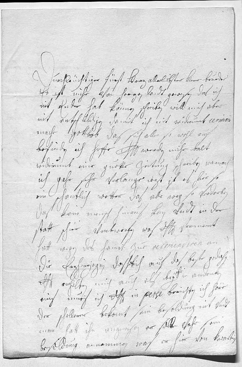 0001Durchleüchtiger Fürst, herzallerliebster herr brueder 0002Es ist mihr von herzen leidt gewesen, das ich 0003nit ender hab können schreiben, will mich aber 0004nit entschuldigen, damit ich nit widerumb cerimoni 0005mache. Gottlob, das sich alle so wohl auf 0006befinden. Ich hoffe, dero Liebden werden mihr balt 0007widerumb eine guette zeitung schreiben, warnach 0008ich gahr sehr verlange. Iezt ist es hier so 0009ein schantlich wetter, das alle weg so verdorben, 0010das kein mensch hinaus kan vndt in der 0011statt schier die wagen vmbwerfen. Was dero Liebden vermeint 0012hatt wegen des Hamilton zue recomendiren an 0013die Erzherzogin, das hab ich auf das beste gedahn, 0014dero Liebden erhalten mich auch als bey ihr in andenken. 0015Eins mues ich dero Liebden in perse berichten, ich höre, 0016der Schellerer bekomt sein besoldung nit vndt 0017man hatt ihn angewisen, er solle vohr sein 0018besoldung annemmen, was er hier von kwartir-