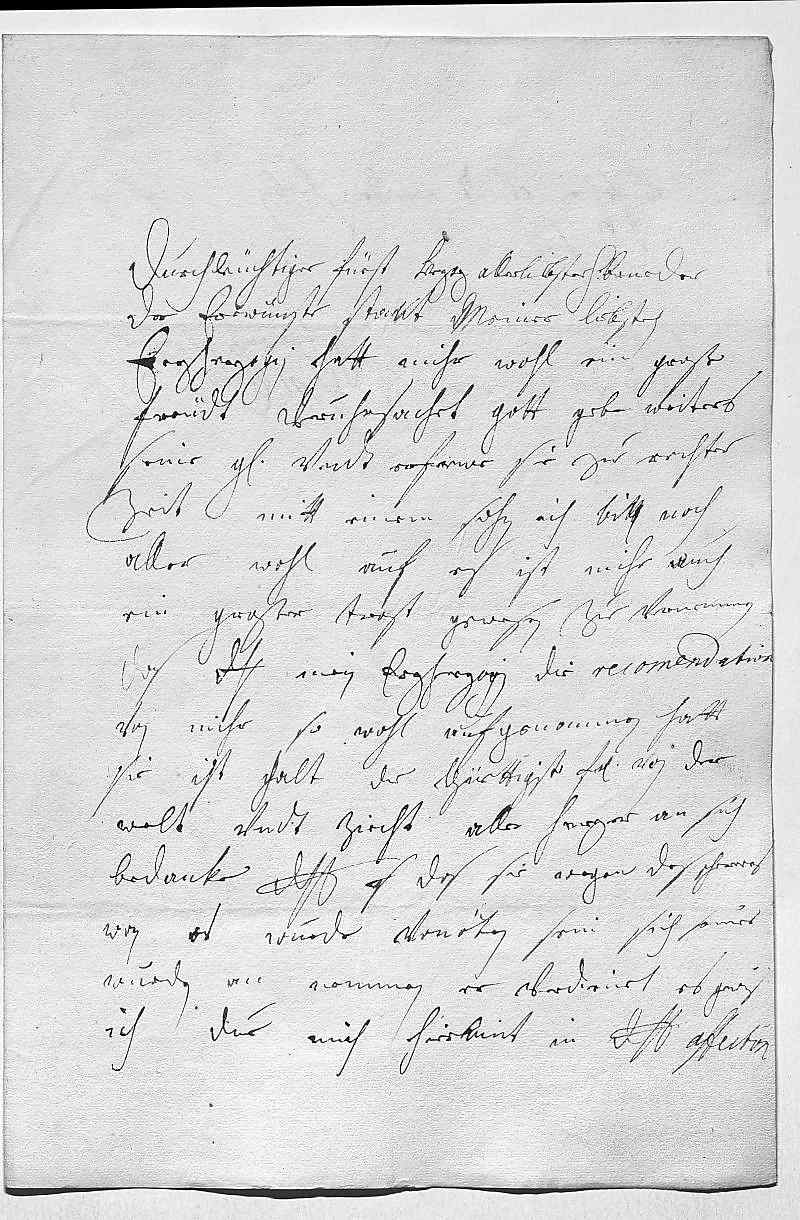 0001Durchleüchtiger Fürst, herzz allerliebster herr brueder 0002Der erwünste stant meiner liebsten 0003Erzherzogin hatt mihr wohl ein große 0004freüdt veruhrsachet, gott gebe weiters 0005seine gnade vndt erfrewe sie zue rechter 0006zeit mitt einem sohn. Ich bin noch 0007aller wohl auf. Es ist mihr auch 0008ein großer trost gewesen zue vernemmen, 0009das dero Liebden mein Erzherzogin die recomendation 0010von mihr so wohl aufgenommen hatt, 0011sie ist halt die güettigste fraw von der 0012welt vndt ziecht aller herzer an sich. 0013Bedanke dero Liebden, s das sie wegen des Schellerers, 0014wan es wurde vonöten sein, sich seines 0015wurden an nemmen, er verdienet es gewis. 0016Ich due mich hiermit in dero Liebden affection