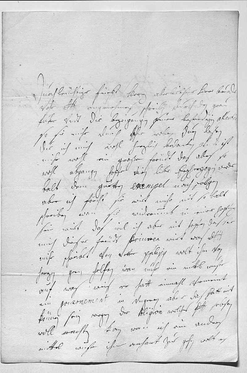 0001Durchleüchtiger Fürst, herz allerliebster herr brueder 0002Vohr dero Liebden angenehmes schreiben durch den Grau 0003Fuker vndt die bezeigungen seiner bestendigen affection, 0004so sie mihr durch ihne wollen duen laßen, 0005due ich mich wohl herzlich bedanken, vndt ist 0006mihr wohl ein große freüdt, das alles so 0007wohl abgangen. Hoffe, die liebe Erzherzogin werde 0008balt dem guetten exempel nach folgen, 0009aber ich förcht, sie wirt mihr nit so balt 0010schreiben, wan sie widerumb in einer hoffnung 0011sein wirt. Das wil ich aber nit hoffen, das sie 0012mich dieser freüdt priuiren wirt. Was dero Liebden 0013mihr schreibet von vetter Pfilipp, wolt ihm von 0014herzen gern helfen, wan nuhr ein mittel wuste 0015auf was weis. Er hatt einmahl vermeint, 0016ein gouernement in Vngeren, aber das hatt nit 0017können sein wegen der religion, welches dero Liebden selbsten 0018woll erachten kan. Wan ich ein anders 0019mittel wuste, ihme anhant zue gehen, wolt es