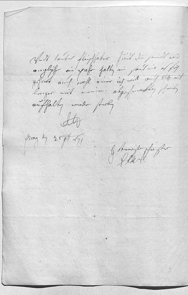 0018vndt lauter fleischhaker hundt, die seindt wie 0019englische, ein pahr halten ein saue wie es sich 0020gehort, auch wohl einer. Ich will auch dero Liebden nit 0021lenger mit meinem abgeschmakten schreiben 0022aufhalten, werde sterben 0023dero Liebden 0024getrewste schwester 0025EMT 0026Prag den 25 novembris 1679