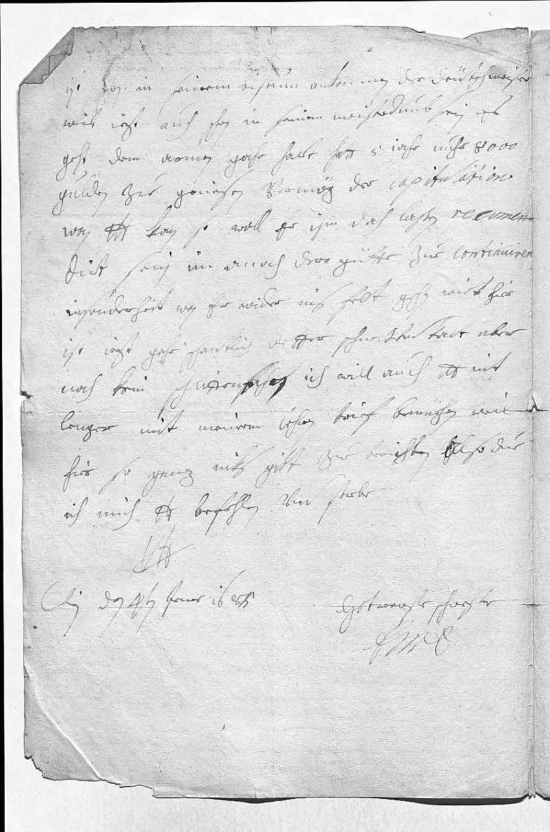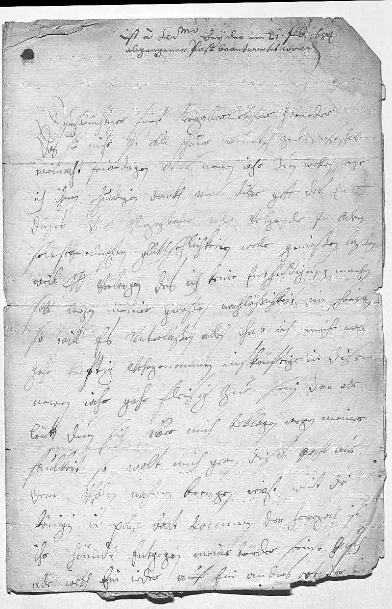 0001ist à Serenissimo bey der am 21 Februarij 1684 0002abgangener post beantwortet worden0003Durchleüchtiger Fürst, herzallerliebster herr brueder 0004Das sie mihr so vill schöner wüntsch zue diesen heiligen 0005weinacht feierdagen vnd newen iahr duen wollen, sage 0006ich ihnen schuldigen dankh vnd bitte gott, das ewer Durchlaucht 0007dieses vnd vnzahlbahre ville volgende in allen 0008selbsterwünschten glükhsehlichkeiten wolle genießen laßen. 0009Weil dero Liebden verlangen, das ich keine entschuldigung machen 0010soll wegen meiner großen nachläßichkeit im schreiben, 0011so will es vnterlaßen. Allein hab ich mihr woll 0012gahr kreftig vohrgenommen, inskönftige in disem 0013newen iahr gahr fleisig zue sein, dan alle 0014leütt duen sich vber mich beklagen wegen meiner 0015faulkeit, so wolt mich gern dises jahr aus 0016dem üblen nahmen brengen. Iezt wirt die 0017Königin in Polen balt kommen. Der Herzoch ist 0018ihr heündt entgegen, meine brüeder seint auch 0019alle wekh, ein ieder auf ein anders ort. Der bruder Franz