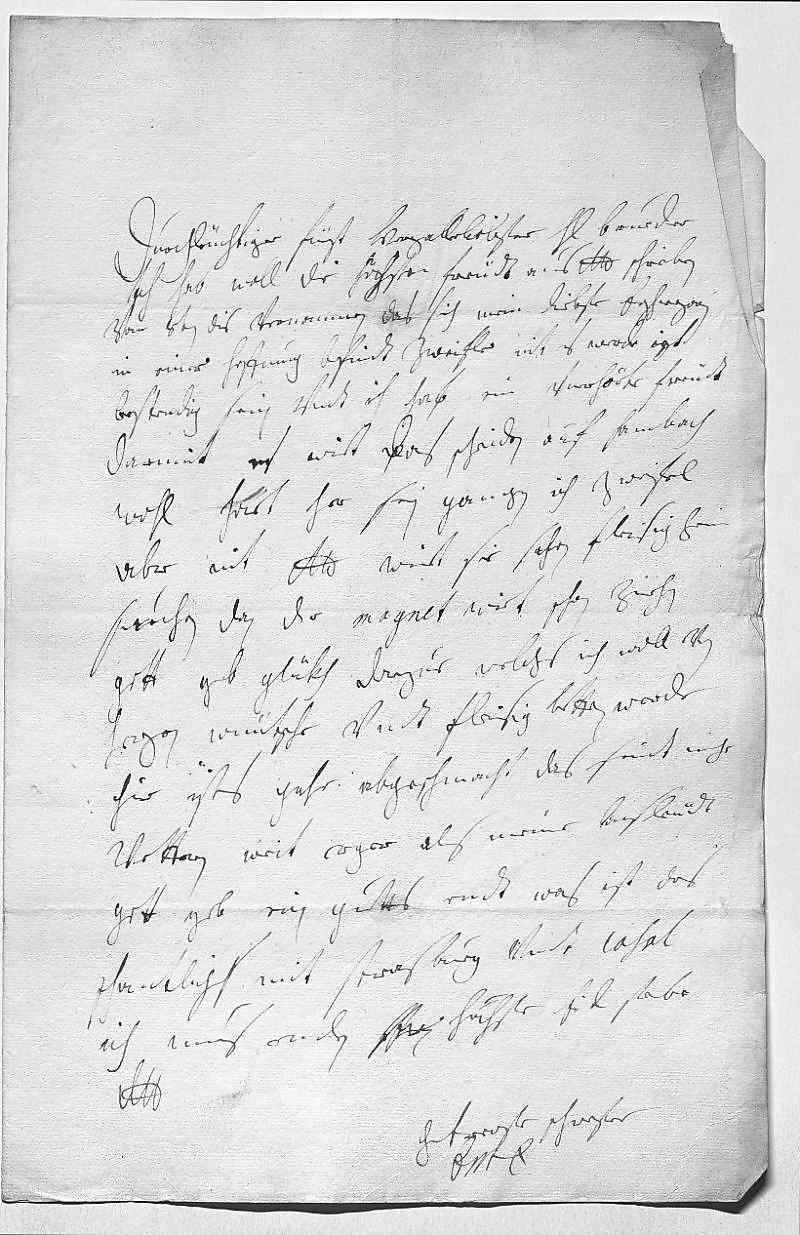 0001Durchleüchtiger Fürst, herzallerliebster herr brueder 0002Ich hab woll die höchste freüdt aus dero Liebden schreiben 0003vom 8ten dis vernommen, das sich mein liebste Erzherzogin 0004in einer hoffnung befindt. Zweifle nit, es werde izt 0005bestendig sein vndt ich hab ein vnerhörte freüdt 0006darmit. es Wirt das scheiden auf Hambach 0007wohl hart her sein gangen, ich zweifel 0008aber nit, dero Liebden wirt sie schon fleisig heim 0009suechen, dan der magnet wirt schon ziehen. 0010Gott geb glükh darzue, welchs ich woll von 0011herzen wüntsche vndt fleisig betten werde. 0012Hir ists gahr abgeschmacht, das seindt mihr 0013vettern, weit erger als meine lansleüdt, 0014gott geb ein guetts endt. Was ist das 0015schantlichs mit Strasburg vndt Casal . 0016Ich mus enden ihn höchster eil, sterbe 0017dero Liebden 0018getrewste schwester 0019EMT