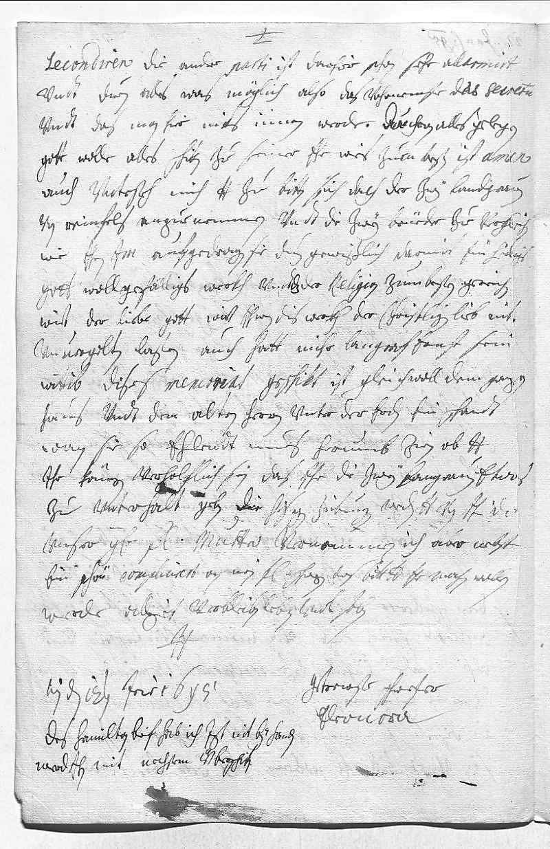 0018secondiren. Die andre parti ist darhier schon sehr allarmirt 0019vndt duen alles, was möglich, also das vohrnemste das secretum 0020vndt das man hier niks innen werde, daran alles gelegen. 0021Gott wolle alles schiken zue seiner ehr, wies zum besten ist, amen. 0022Auch vntersteh mich dero Liebden zu bitten, sich doch der zwey Landgrauen 0023von Reinfels anzuenemmen vndt die zwey brüeder zue vergleichen, 0024wie ihnen ihr Mayestät aufgedragen. Sie duen gewißlich darmit ein heiligs, 0025gott wollgefälligs werkh vndt das der religion zum besten gereichen 0026wirt, der liebe gott wirt ihnen dis werkh der christligen lieb nit 0027vnuergolten laßen. Auch hatt mihr Langraf Ernst sein 0028wittib dises memorial geschikt, ist gleichwoll dem ganzen 0029haus vndt dem alten herrn vnter der erden ein schandt, 0030wan sie so ehlendt mues herumb zien, ob dero Liebden 0031ihr können verholflich sein, das ihr die zwey Langrauen etwas 0032zue vnterhalt geben. Die hisigen zeitung werden dero Liebden von ihr Durchlaucht, 0033vnser geliebsten fraw mutter, vernemmen, ich aber nebst 0034ein schön compliment an mein fraw schwegerin, das bitt dero Liebden ihr machen wollen, 0035werde allzeit verbleiben, leben vndt sterben 0036dero Liebden 0037getrewste schwester 0038Eleonora 0039Wien den 12ten jener 16950040Des Hamilton brif hab ich jezt nit bey handen, 0041werd ihn mit nechstem überschiken.