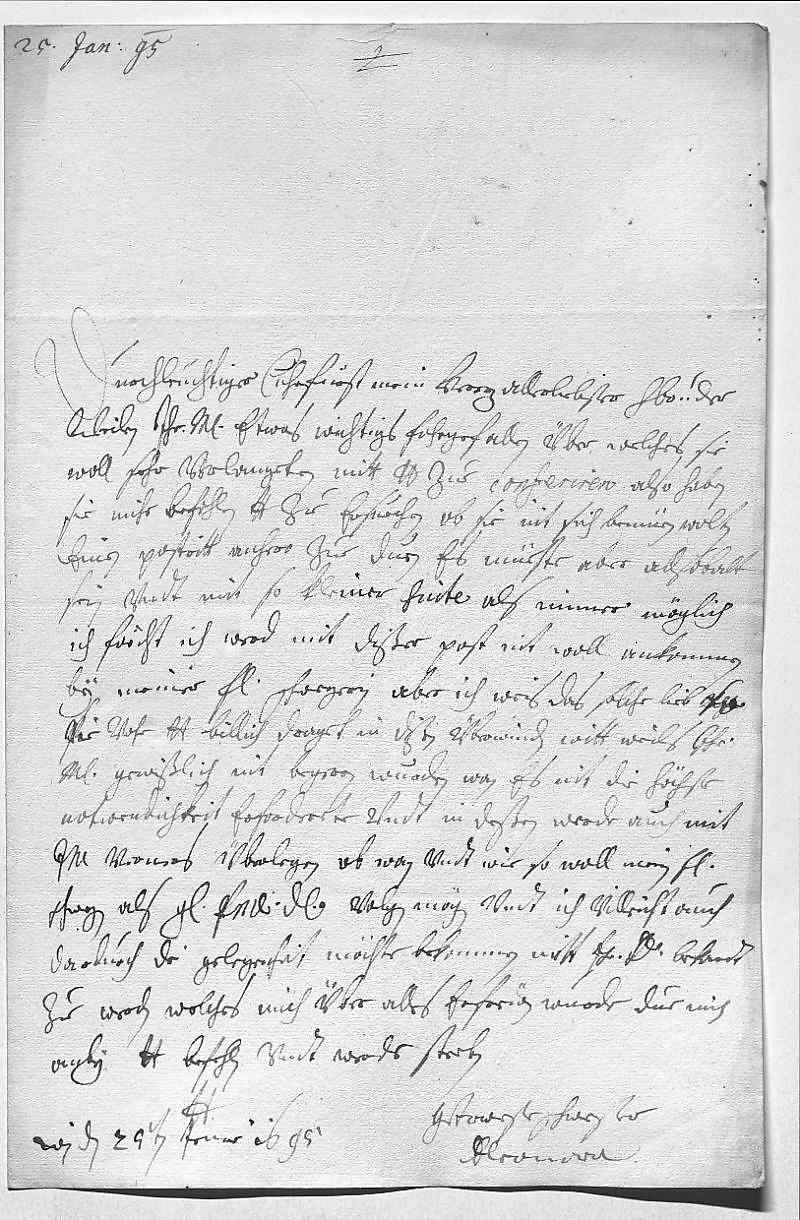 000125. Januarij 950002Durchleüchtiger Cuhrfürst, mein herzallerliebster herr bruder 0003Weilen ihr Mayestät etwas wichtigs fohrgefallen, über welches sie 0004woll sehr verlangeten mitt dero Liebden zue conferiren, also haben 0005sie mihr befohlen dero Liebden zue ersuechen, ob sie nit sich bemüen wolten, 0006einen postritt anhero zue duen. Es müeste aber allsobalt 0007sein vndt mit so kleiner suite als immer möglich. 0008Ich förcht, ich werd mit dißer post nit woll ankommen 0009bey meiner fraw schwegerin, aber ich weis, das solche lieb, so 0010sie vohr dero Liebden billich draget, in dißen überwinden wirtt, weils ihr 0011Mayestät gewißlich nit begeren wurden, wan es nit die höchste 0012notwendichkeit erforderete, vndt in deßen werde auch mit 0013ihr Mayestät verners überlegen, ob, wan vndt wie so woll mein fraw 0014schwegerin als geliebste fraw mutter Durchlaucht volgen mögen vndt ich villeicht auch 0015dardurch die gelegenheit möchte bekommen, mitt ihr Liebden bekandt 0016zue werden, welches mich über alles erfrewen wurde. Due mich 0017anbey dero Liebden befehlen vndt werde sterben 0018dero Liebden 0019getreweste schwester 0020Eleonora 0021Wien den 25ten jener 1695