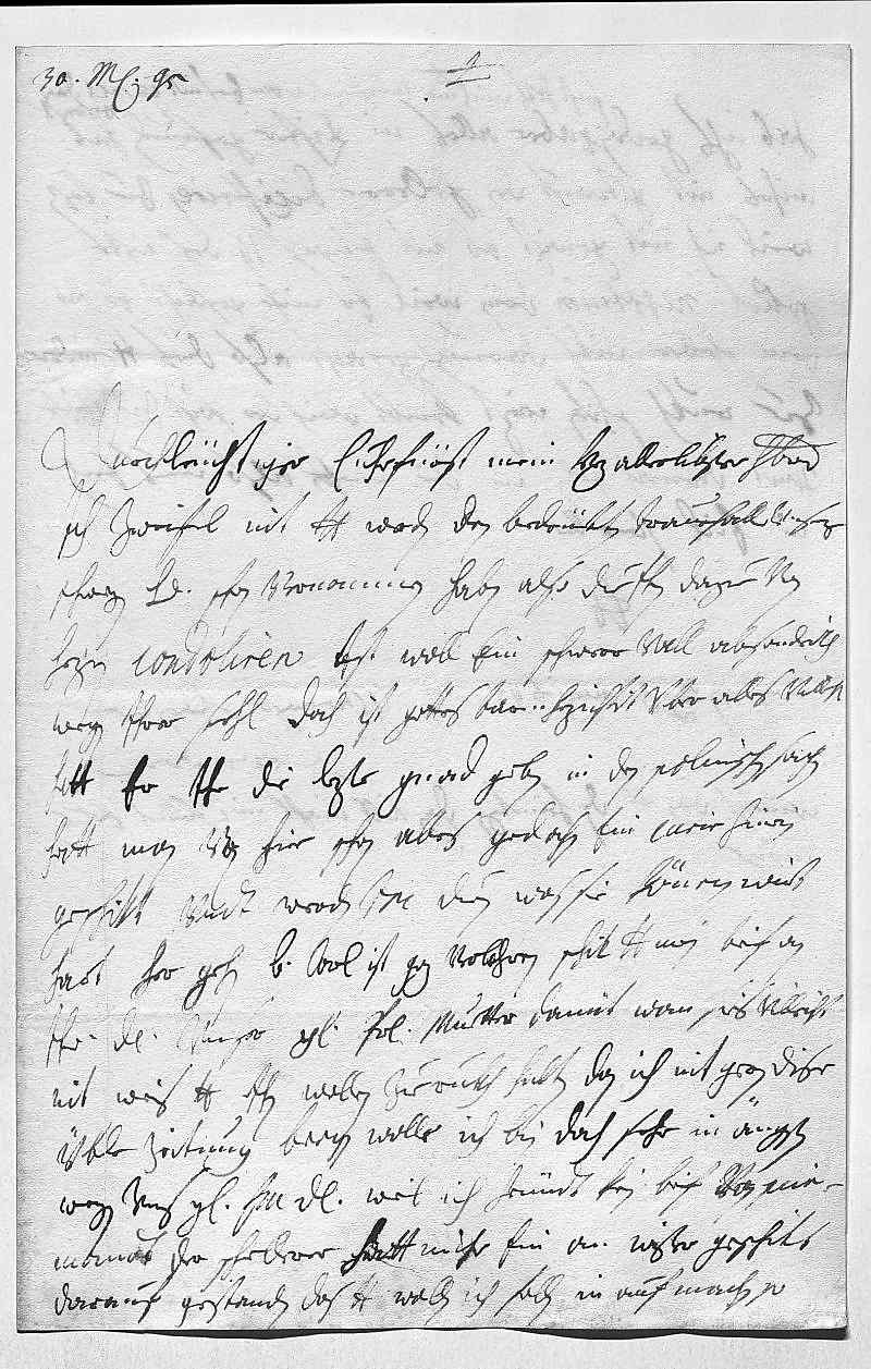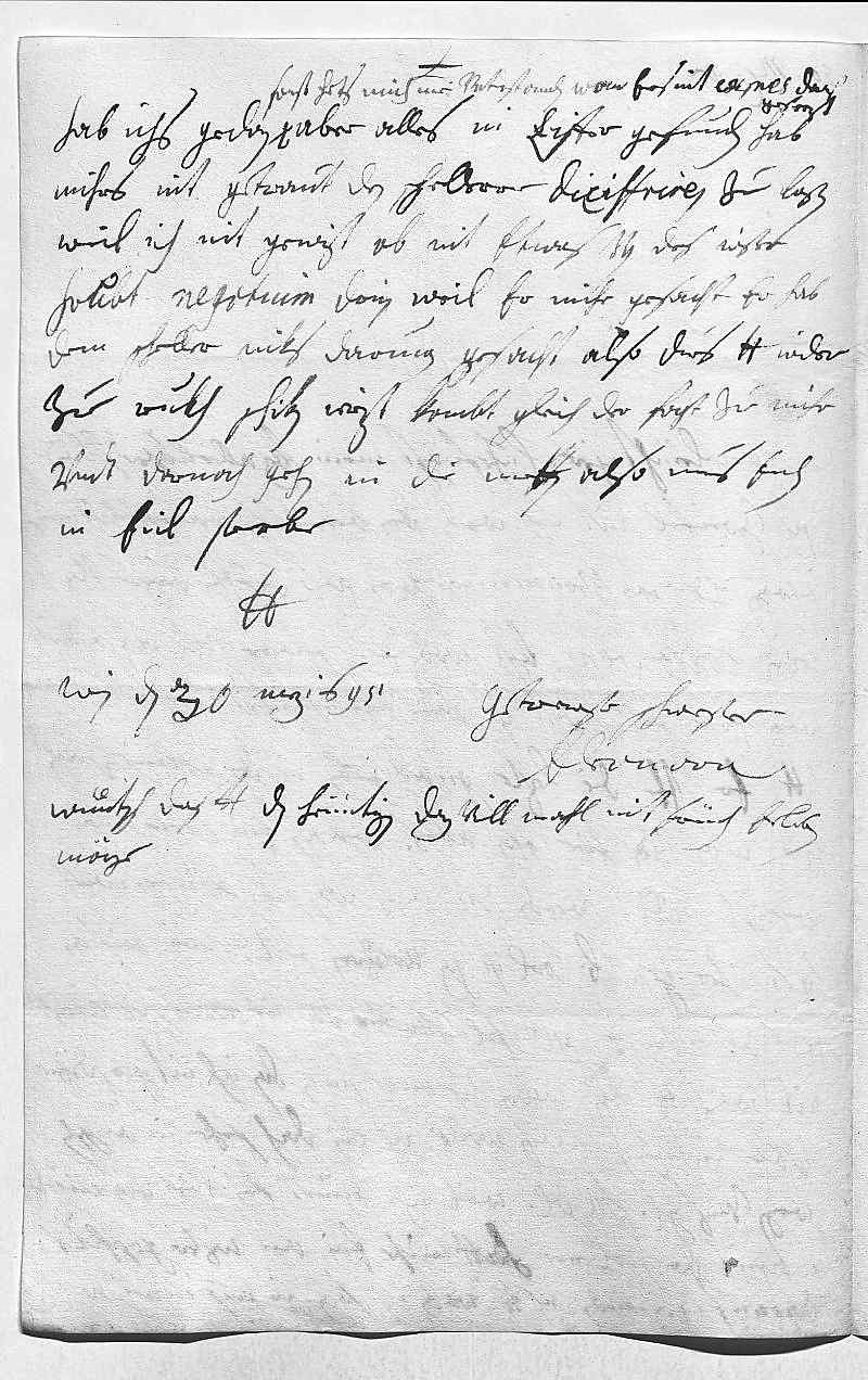 0017hab ichs gedan, sonst hets mich nie vnterstanden, wan ers nit expres darauf gesezt, aber alles in ziffer gefunden. Hab 0018mihrs nit getraut den Schellerer diziffriren zu laßen, 0019weil ich nit gewist, ob nit etwas von des Wißer 0020haubt negotium drin, weil er mihr gesacht, er hab 0021dem Scheller niks daruon gesacht, also dues dero Liebden wider 0022zue rukh schiken. Iezt kombt gleich der Fogt zue mihr, 0023vndt darnach gehn in die meß, also mus enden 0024in eil, sterbe 0025dero Liebden 0026getrewste schwester 0027Eleonora 0028Wien den 30 merz 16950029Wuntsch, das dero Liebden den heüntigen dag vill mahl mit freüden erleben 0030möge.