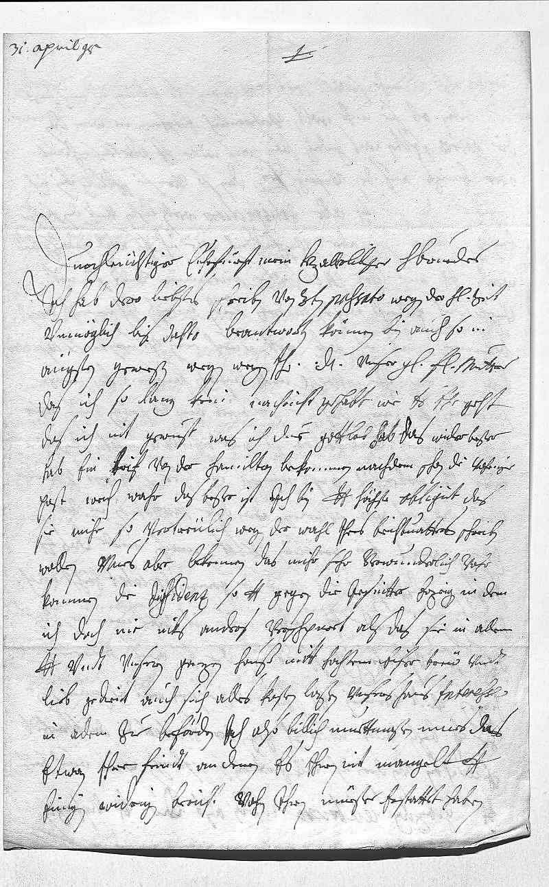 000131. april 9510002Durchleüchtiger Cuhrfürst, mein herzallerlibster herr brueder 0003Ich hab dero liebstes schreiben von 3ten passato wegen der heiligen zeit 0004vnmöglich bis dahto beantworten können. Bin auch so in 0005ängsten geweßen wegen wegen ihr Durchlaucht, vnser geliebsten fraw mutter, 0006das ich so lang kein nachricht gehabt, wie es ihr geht, 0007das ich nit gewust, was ich due. Gottlob hab ich nachricht, das wider beßer, 0008hab ein brif von der Hamilton bekommen, nachdem schon die vohrige 0009post wech wahr, das beßer ist. Ich bin dero Liebden höchste obligirt, das 0010sie mihr so vertreülich wegen der wahl ihres beichtuatters schreiben 0011wollen, mues aber bekennen, das mihr sehr verwunderlich vohr 0012kommen die diffidenz, so dero Liebden gegen die jesuitter erzeigen, in dem 0013ich doch nie niks anders verschpuret, als das sie in allem 0014dero Liebden vndt vnsern ganzen hauß mitt hochstem eifer, trew vndt 0015lieb gedient, auch sich alles kosten laßen, vnsers haus interesse 0016in allem zue befördren, ich also billich muettmaßen mues, das 0017etwan ihre feindt, an denen es ihnen nit mangelt, dero Liebden 0018einigen widrigen bericht vohn ihren müeße erstattet haben.