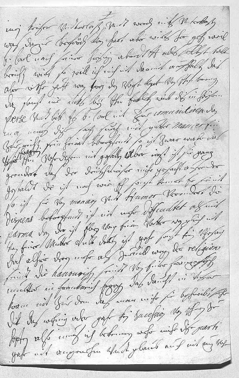 0018daruohr, was einer etwan duet, vndt ich zwar glaub, er 0019due es in gutter intention vndt nuhr ein mangel, das 0020er die sachen nit gnuechsam capirt. Mein beichtuatter 0021aber vndt die andren erkennen die vhrsachen gahr woll vndt 0022hatt er mich noch heündt gewarnt acht zue haben, weil man 0023in dißer sach wider aufs new laborire. Das andre soll sein 0024wegen der Rummel . In disen geschicht ihnen woll hart vndt vnrecht, 0025dan einmahl er selber vndt kein ander ander mensch 0026in der welt die vhrsach. Es wehr mihr woll herzlich 0027leidt, wan diße armen leüt wegen diser vhrsach vnschuldich 0028solten leiden müeßen, aber entlich müst ich auch dis 0029lieber erdragen als meinem sohn und gewissen0030in gefahr sezen. Vndt beken ich, wie ich dise sach findt, 0031wan alle iesuitter mitt meinem beoichtua0032tter mich auf denknien bitteten vndt ich0033es nit anderst findete als iezt, sie nichts0034endren wurden. Ich bin auch versichert, wan dero Liebden alles 0035wusten, welchs gahr zue weitlaüfig zue schreiben, sie einer 0036andren meineung sein wurden. Hoff aber nit, das die vnschuldige 0037dis wegen werden leiden, ich habe auch mein beichtuatter gebetten, sich hirin 0038nit einzuemischen. Bruder Carl wirt iezt, mein ich, balt ein 0039postritt nuhr auf etlich wehnig dag her duen, wegen der 0040litawischen sach eins vndt anders abzuereden. Ihr Mayestät,