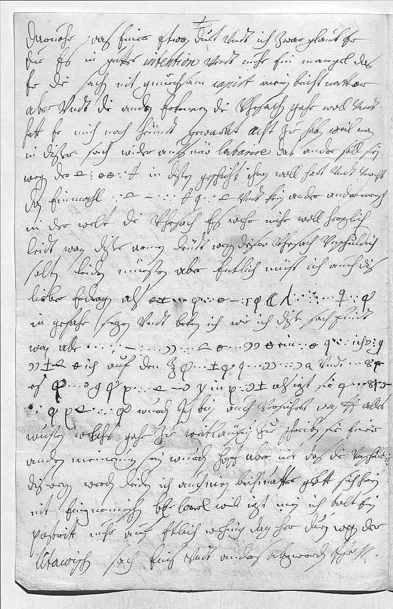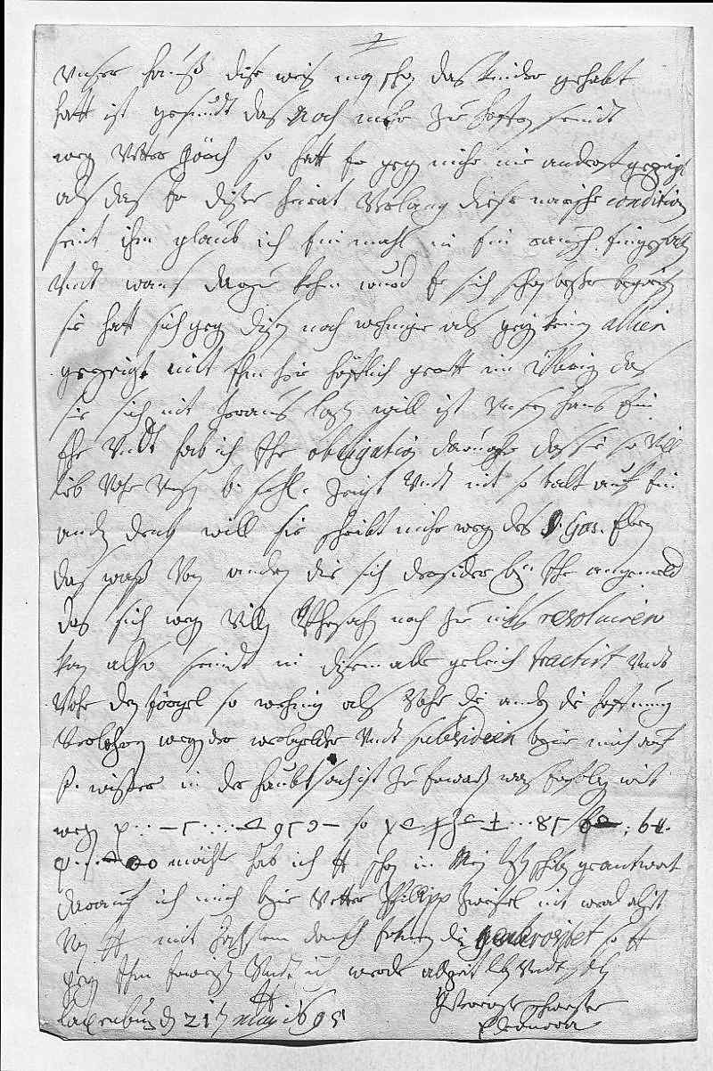 0064vnser hauß . Dise weis man schon, das kinder gehabt 0065hatt, ist gesundt, das noch mehr zue hoffen seindt. 0066Wegen vetter Görch, so hatt er gegen mihr nie anderst gezeigt, 0067als das er dißer heirat verlang, diese narische conditionen 0068seint ihm, glaub ich, ein mahl in ein rausch eingefallen, 0069vndt wans dazue kehm, wurd er sich schon beßer begreifen. 0070Sie hatt sich gegen disen noch wehniger als gegen keinen allien 0071gezeigt, mit ihm hier höfflich gerett, im übrigen, das 0072sie sich nit heraus laßen will, ist vnsern haus ein 0073ehr vndt hab ich ihr obligation daruohr, das sie so vill 0074lieb vohr vnsern bruder sehligen zeigt vndt nit so balt auf ein 0075andern denken will. Sie schreibt mihr wegen des von Goes eben 0076das, waß von andren, die sich dersider bey ihr angemeld, 0077das sich wegen villen vhrsachen noch zue niks resoluiren 0078kan. Also seindt in disem alle geleich tractirt vndt 0079vohr den Jörgel so wehnig als vohr die andren die hoffnung 0080verlohren. Wegen der werbgelder vndt subsidien bezie mich auf 0081Pater Wißer . In der haubtsach ist zu erwarten was erfolgen wirt, 0082wegen des herahts, so Frankreich propo- 0083niren möchte, hab ich dero Liebden schon in mein lezten schreiben geantwort, 0084darauf ich mich bezie. Vetter Pfilipp, zweifel nit, werd alzeit 0085von dero Liebden mit höchstem dankh erkenen die generositet, so dero Liebden 0086gegen ihm erweißen, vndt ich werde allzeit leben vndt sterben 0087dero Liebden 0088getrewste schwester 0089Eleonora 0090Laxenburg den 21ten maij 1695