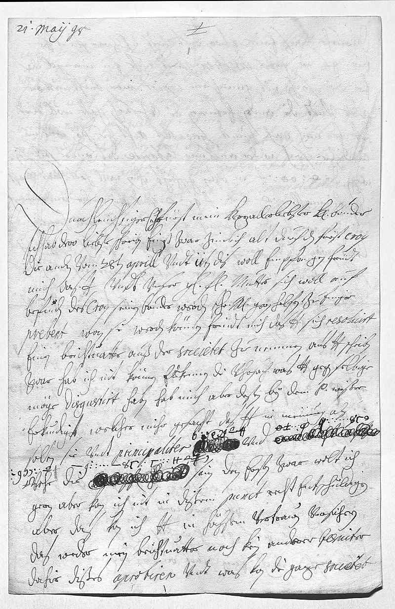 000121. maij 950002Durchleüchtiger Cuhrfürst, mein herzallerliebster herr bruder 0003Ich hab dero liebste schreiben, einß zwar zimlich alt, durch den Fürst Croy, 0004die andren vom 28ten aprill vndt 11ten dis woll empfangen. Freüdt 0005mich, das dero Liebden vndt vnser geliebste fraw muetter sich woll auf 0006befinden. Des Croy seinen bruder werden ihr Mayestät gern helfen zu einiger 0007prebent, wan sie werden können. Freüdt mich, das dero Liebden sich resoluirt, 0008einen beichtuatter auß der soceietet zue nemmen. Aus dero Liebden schreiben 0009zwar hab ich nit können erkennen die vhrsach, was dero Liebden gegen selbige 0010möge disgustirt haben, hab mich aber deßen bey dem Pater Wißer 0011erkundigt, welcher mihr gesacht, das dero Liebden in meinung, als 0012solten sie vndt principaliter pedari vnd mein beicht 0013vatter vohr die savoische heirat sein. Den ersten zwar wolt ich 0014gern, aber kan ich nit in disem punct recht entschuldigen, 0015aber das kan ich dero Liebden in höchstem vertrawen versichern, 0016das weder mein beichtuatter noch kein anderer jesuiter 0017dahir dißes aprobiren, vndt was kan die ganze societet