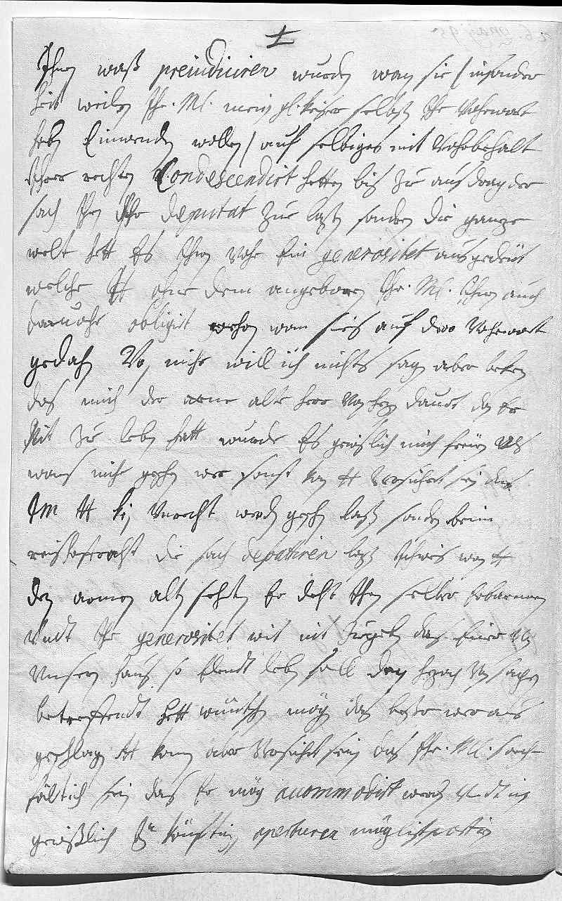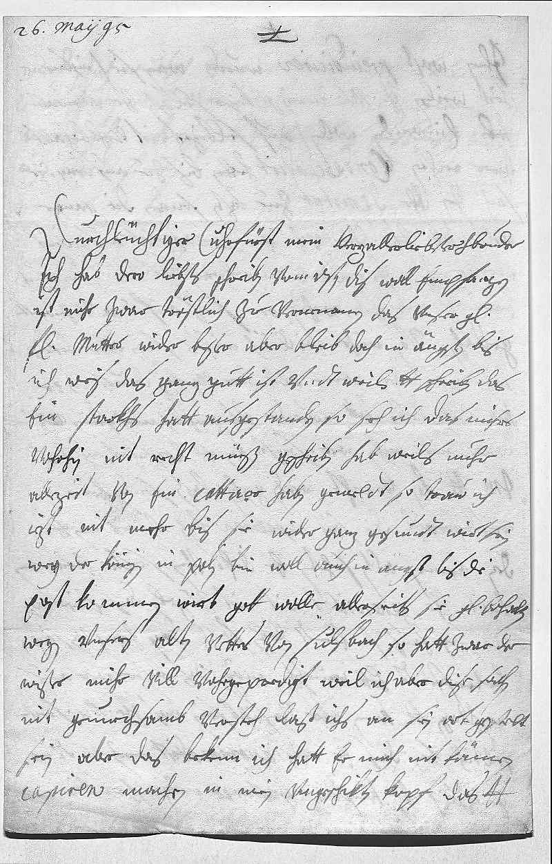 000126. maij 950002Durchleüchtiger Cuhrfürst, mein herzallerliebster herr bruder 0003Ich hab dero liebsts schreiben vom 17ten dis woll empfangen. 0004Ist mihr zwar tröstlich zue vernemmen, das vnser geliebste 0005fraw mutter wider beßer, aber bleib doch in ängsten, bis 0006ich weis, das ganz gutt ist, vndt weil dero Liebden schreiben, das 0007ein starkhs hatt ausgestanden, so seh ich, das mihrs 0008vohrhin nit recht müeßen geschriben haben, weils nuhr 0009allezeit von ein cattarr haben gemeldt, so traw ich 0010iezt nit mehr, bis sie wider ganz gesundt wirt sein. 0011Wegen der Königin in Polen bin woll auch in angst, bis die 0012post kommen wirt, gott wolle allerseits sie gnädig erhalten. 0013Wegen vnsers alten vetters von Sulsbach, so hatt zwar der 0014Wißer mihr vill vohrgepredigt, weil ich aber dise sachen 0015nit genuechsamb versteh, laß ichs an sein ort gestelt 0016sein, aber das bekenn ich, hatt er mich nit können 0017capiren machen in mein vngeschikten kopf, das dero Liebden