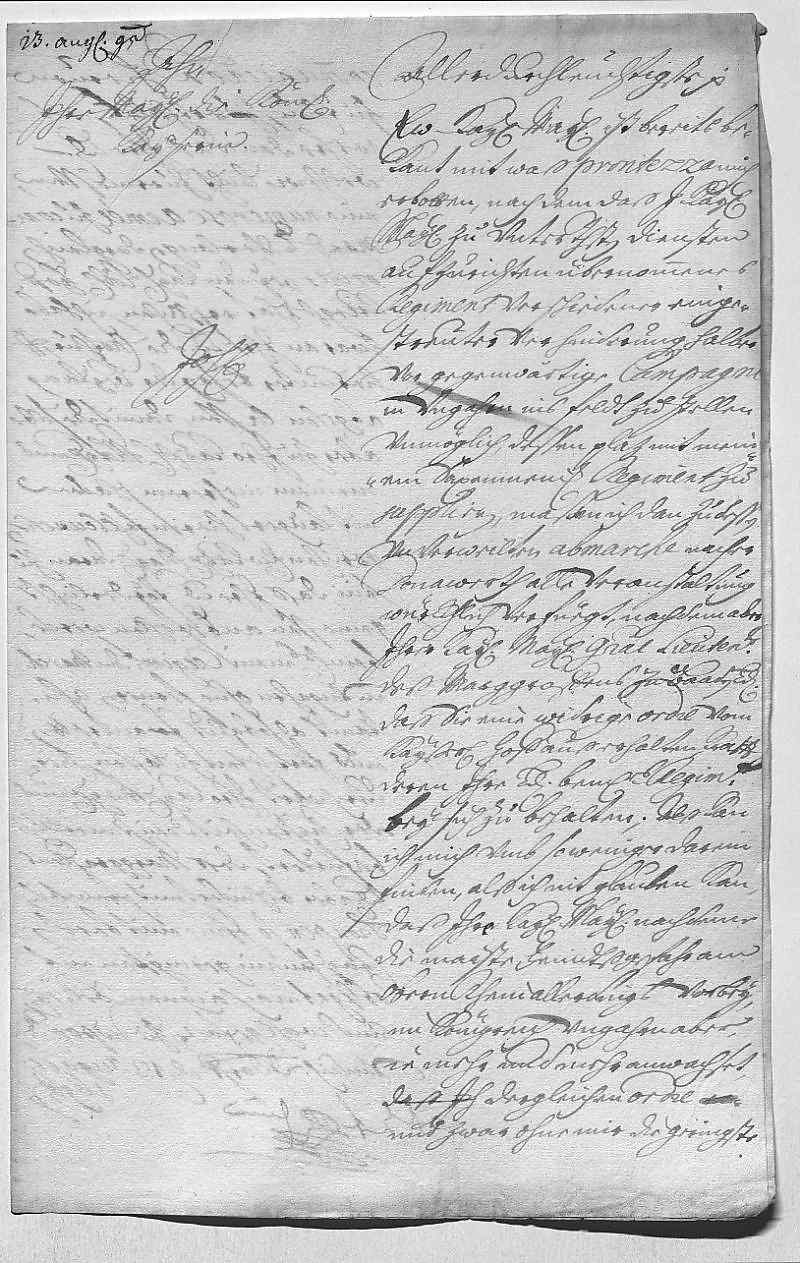 JWs Regiment ist auf seinem Weg nach Ungarn vom Markgrafen von Baden aufgehalten worden, der behauptet, dies auf Befehl des Kaiserhofs zu tun; womöglich hat er sich eine entsprechende Anweisung beim Hofkriegsrat erschlichen. Bittet um rasche Klarstellung, damit sein Regiment weitermarschieren kann, denn die Gefahr am Oberrhein ist nicht mehr so groß, während sie in Ungarn immer mehr zunimmt.