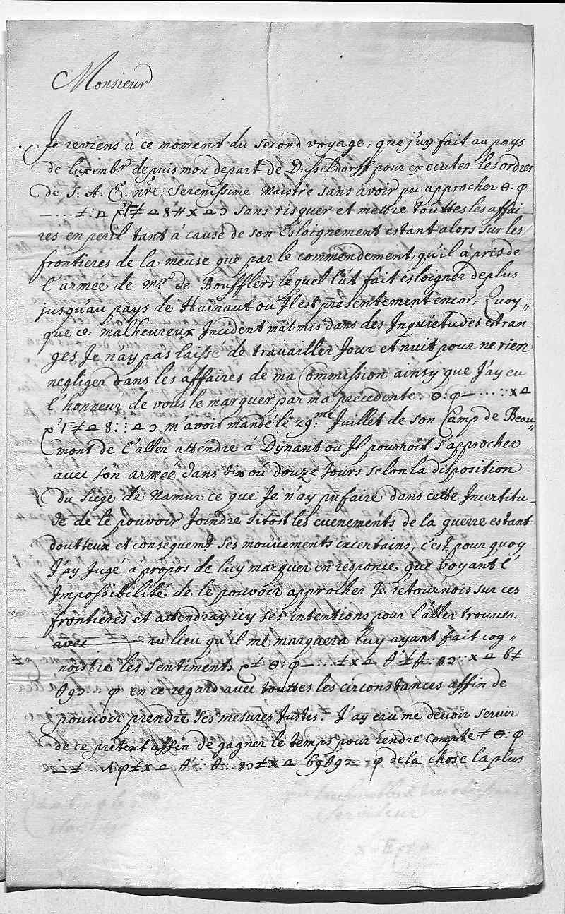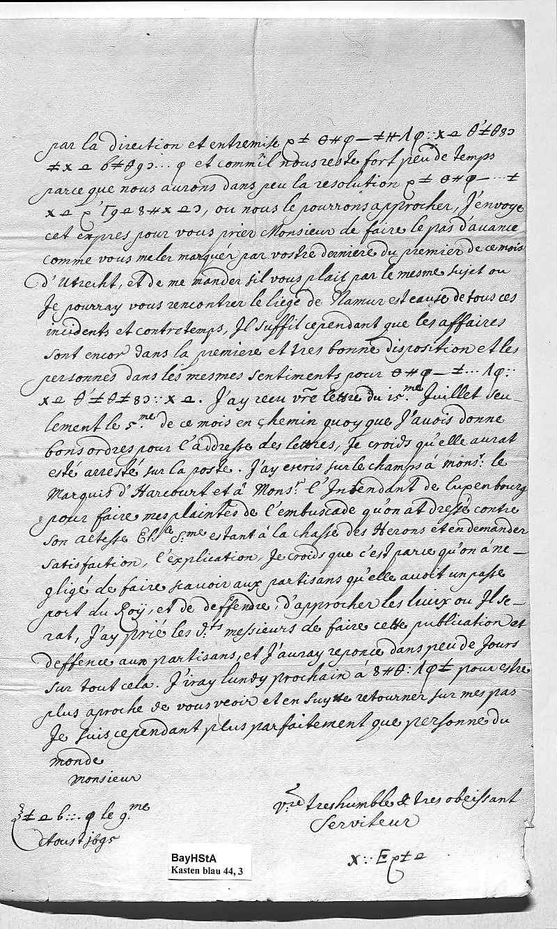 Weiß aus einem Brief seines Obristkämmerers Hamilton, dass der Schellerer von seinen über den Veyder laufenden Friedensverhandlungen weiß. Da JW ihm dies verheimlicht hat und in dieser Sache alles an der Geheimhaltung hängt, bittet er EMT, künftig nur noch mit dem Kaiser darüber zu sprechen.