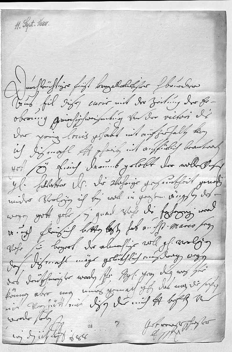 0001Durchleüchtiger Fürst, herzallerliebster herr brueder 0002Aus eil, disen curir mit der zeitung der er- 0003oberung Griechischweisenburg vnd der victori, die 0004der Prinz Louis gehabt, nit aufzuehalten, kan 0005ich dis mahl dero Liebden schreiben nit ausfürlich beantworten. 0006Gott sey ewich darumb gelobt, der wolle vnsern 0007gnädigen herrn vatter Durchlaucht die vohrige gesuntheit genedig 0008wider verleyen. Ich bin woll in großem ängsten des- 0009wegen, gott gebe sein gnad. Vohr die Erzherzogin werd 0010auch fleisich betten laßen, hab auch Pater Marco segen 0011vohr sie begert, der almechtige woll gnädig verleyen, 0012das dismahl möge gelükhlich ausdragen. Wegen 0013des Deütschmeister werden ihr Mayestät gern duen, was sie 0014können, aber man mues gemach gehen, das man die supen 0015nit verschütt. Mit disen due mich dero Liebden befehlen vnd 0016werde sterben 0017dero Liebden 0018getrewste schwester 0019EMT 0020Wien den 11ten septembris 1688