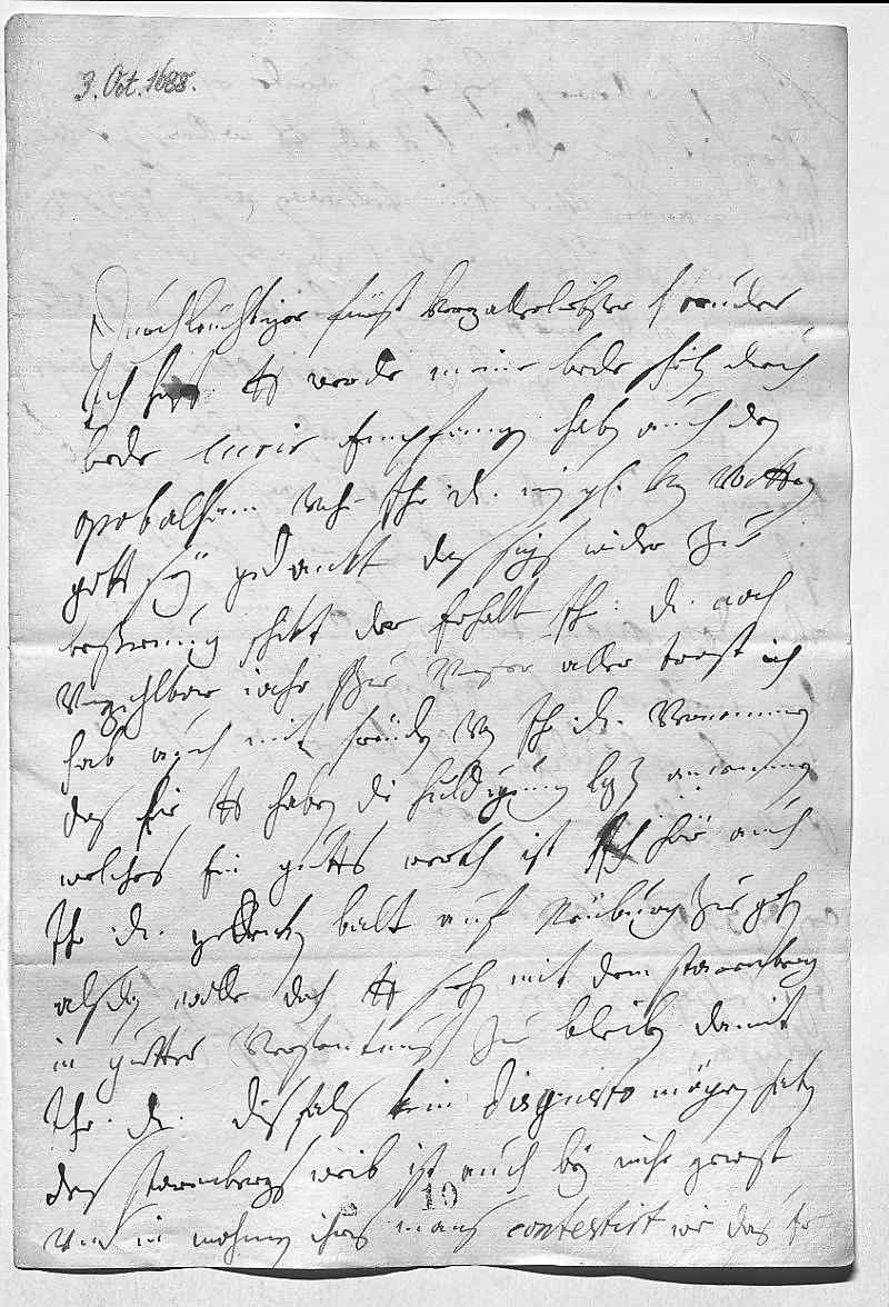 0017sich auf alleweis befleisen werde, dero Liebden treü vnd 0018fleisist zue dienen. Bitt allein, dero Liebden wollens so von 0019ihm glauben vnd ein vertrawen auf ihn sezen, 0020vnd ich glaubs gewißlich, das ers duen wirt 0021vnd dero Liebden vill guett dienst leisten vnd auf alle 0022weis suechen, dero Liebden gnad zue meritiren. Hier sagt 0023man ein schlimme zeitung, als solte Cöllen 0024berent sein, gott woll geben, was zu seiner er 0025ist. Mus in eil enden, seindt heündt schpaht 0026von dominicanern kommen. Bitt mich deswegen 0027bey meiner libsten Erzherzogin vnd bruder Carl 0028zue entschuldigen, schik hierbey ein brif von 0029Pater Marc vnd sterbe 0030dero Liebden 0031getrewste schwester 0032EMT 0033Wien den 3ten octobris 16880034Jezt gleich sagt man, es sey 0035Pfilipsburg vnd nit Cöllen 0036berent.