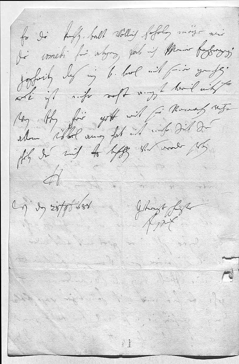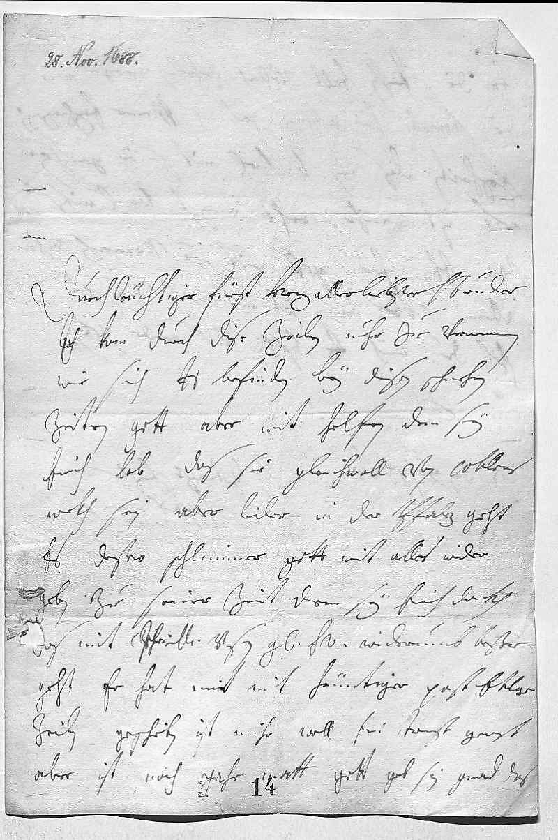 0013er die kreften balt völlich erholen möge. Wie 0014die comedi hie abgangen, hab ich meiner Erzherzogin 0015geschriben. Das mein bruder Carl mit seiner gemahlin 0016wek, ist mihr recht angst, weil niks 0017von ihnen hör, gott wirt sie verwahren vohr 0018allem übel, amen. Hab nit mehr zeit zue 0019schreiben, due mich dero Liebden befehlen vnd werde sterben 0020dero Liebden 0021getrewste schwester 0022EMT 0023Wien den 28ten novembris 1688